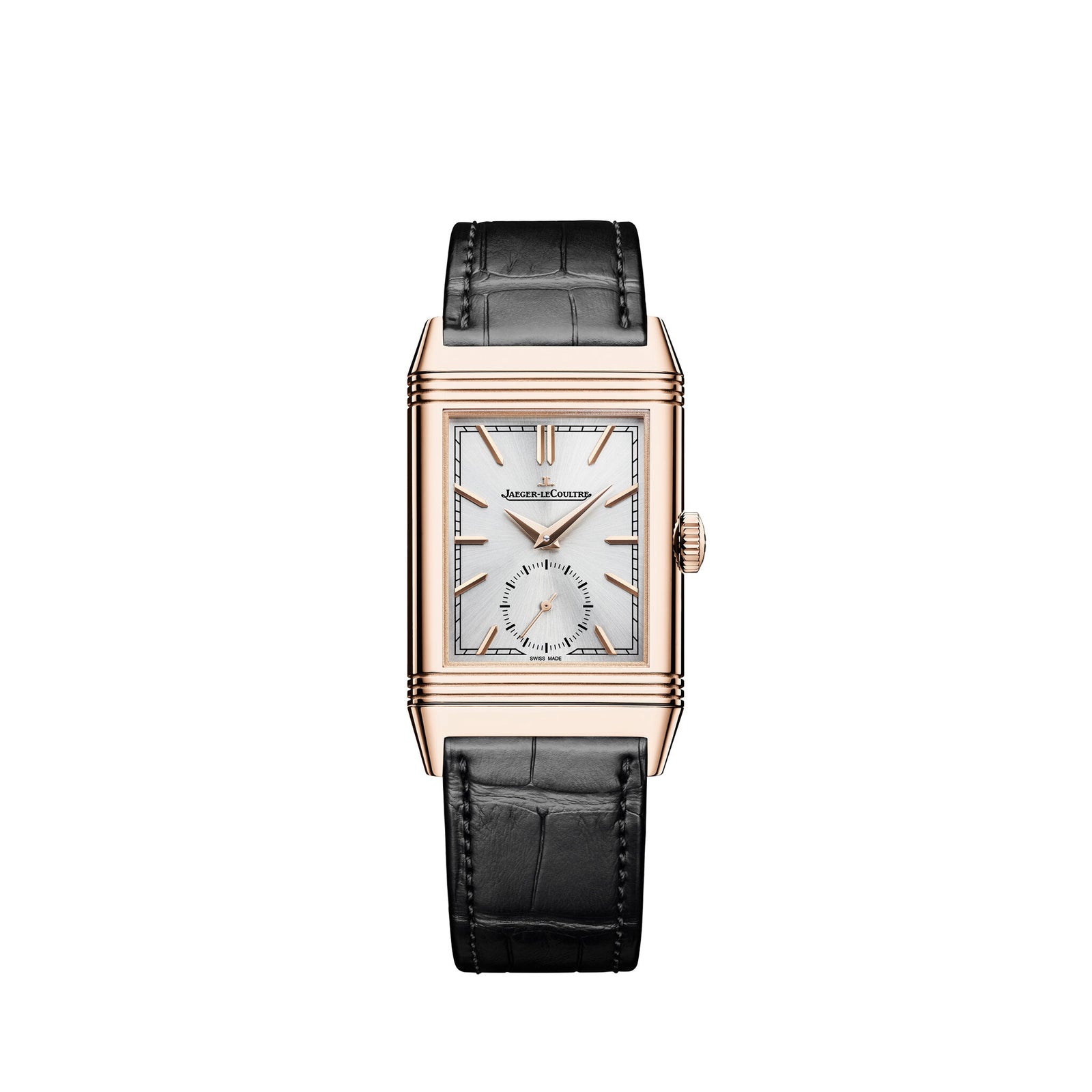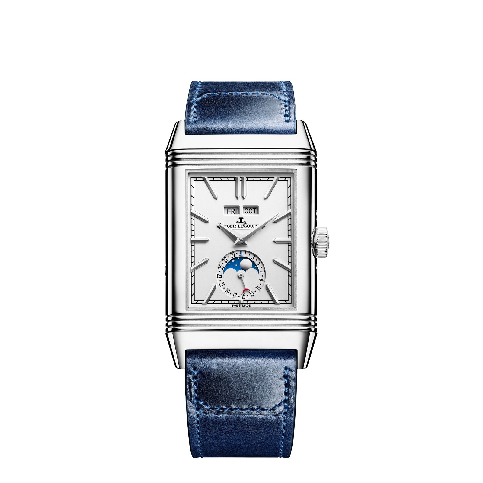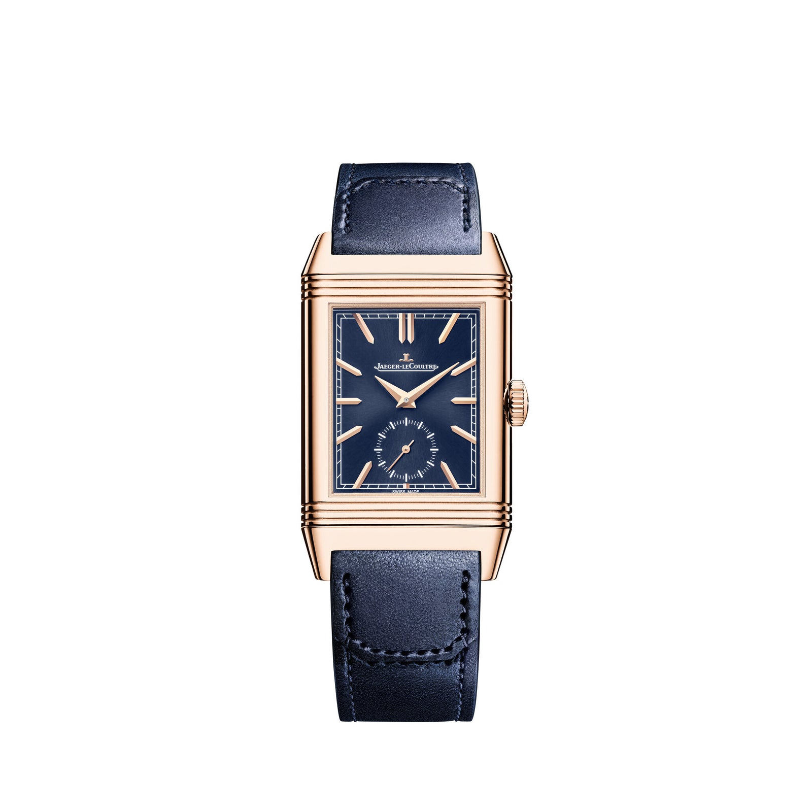 • Men's wristwatch in rose gold with automatic movement, calibre 868AA, polished bezel and sapphire crystal; blue dial with Arabic numerals and indexes, central seconds, day, date and month displays and moon phase; blue rubber strap with pin buckle; water resistance 10.
