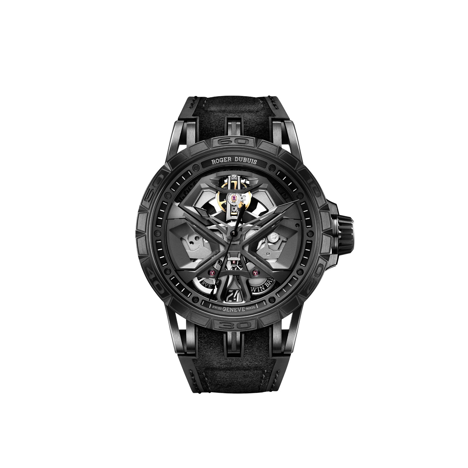 • 男士腕表,手动上弦,白金表壳,表圈镶嵌钻石,表镜为蓝宝石玻璃;镂空表盘,无时标、无日期与无秒针显示;黑色皮表带,折叠表扣;防水 100。