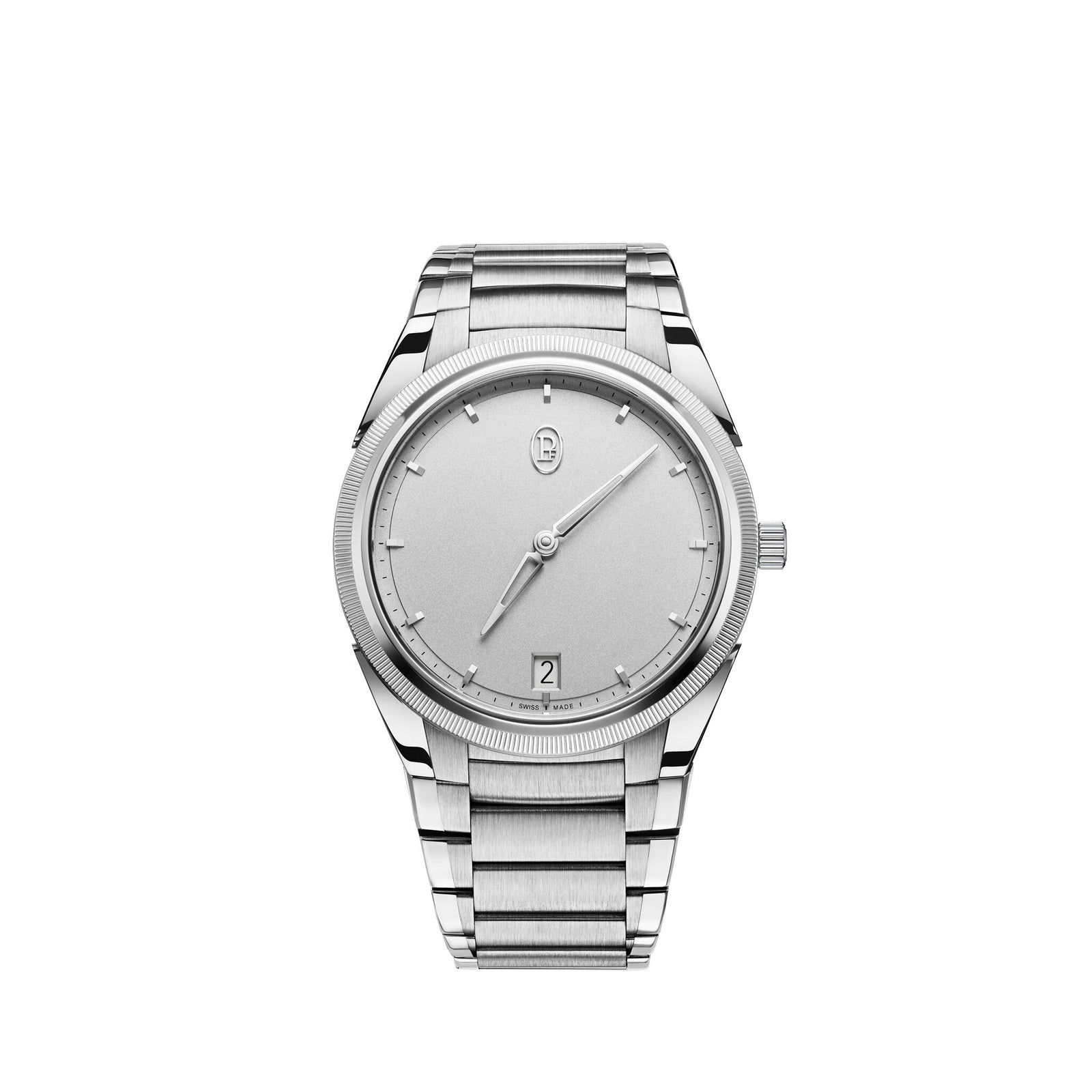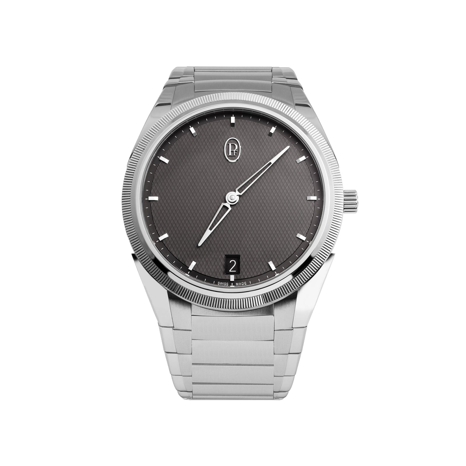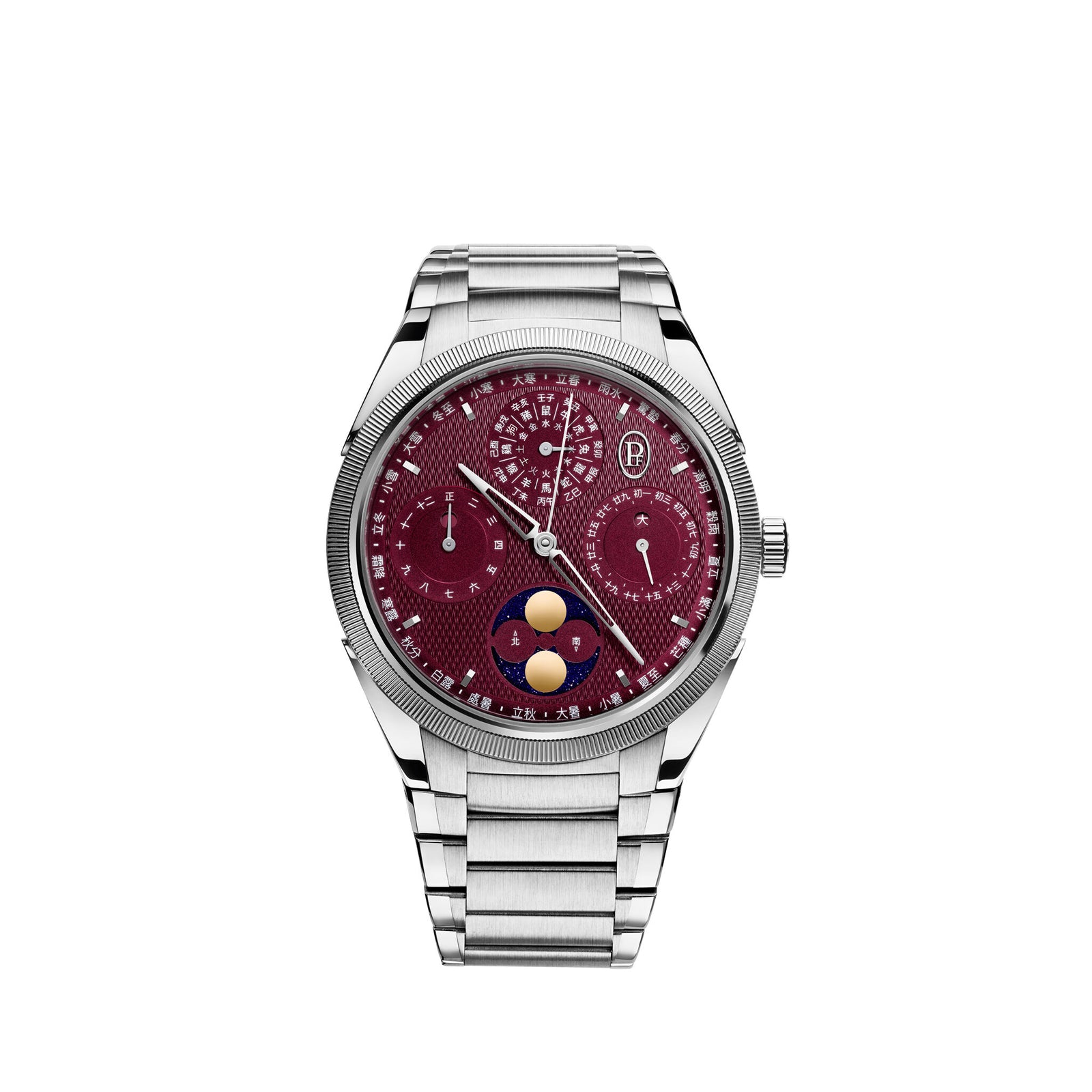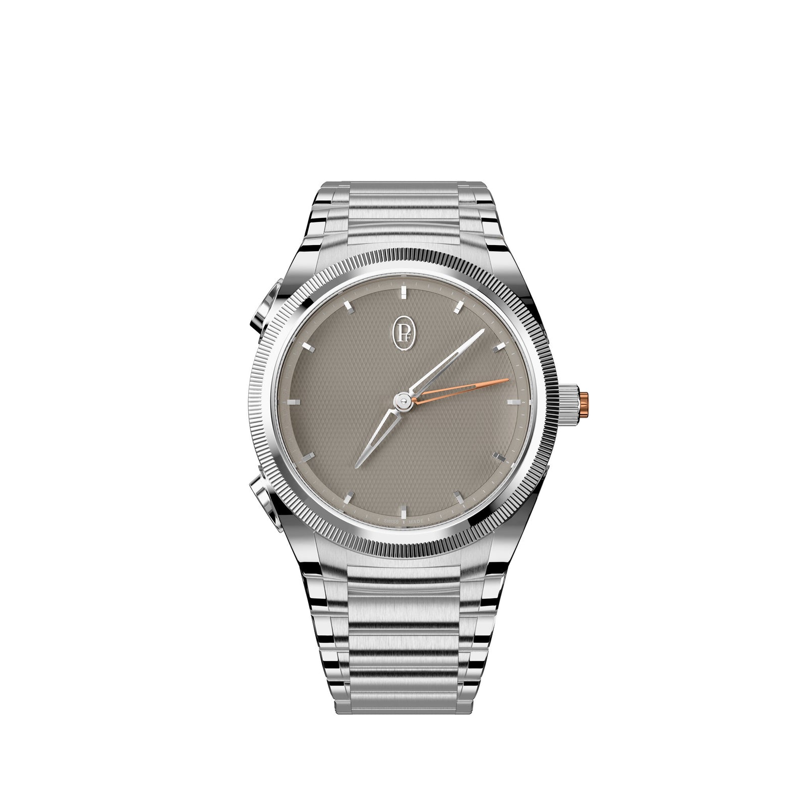 • 男士腕表,采用自动机芯,钢制银色表壳,配抛光表圈与蓝宝石玻璃,灰色表盘配时标。具计时、日期、偏心秒针和防水 100,红色橡胶表带配折叠扣。