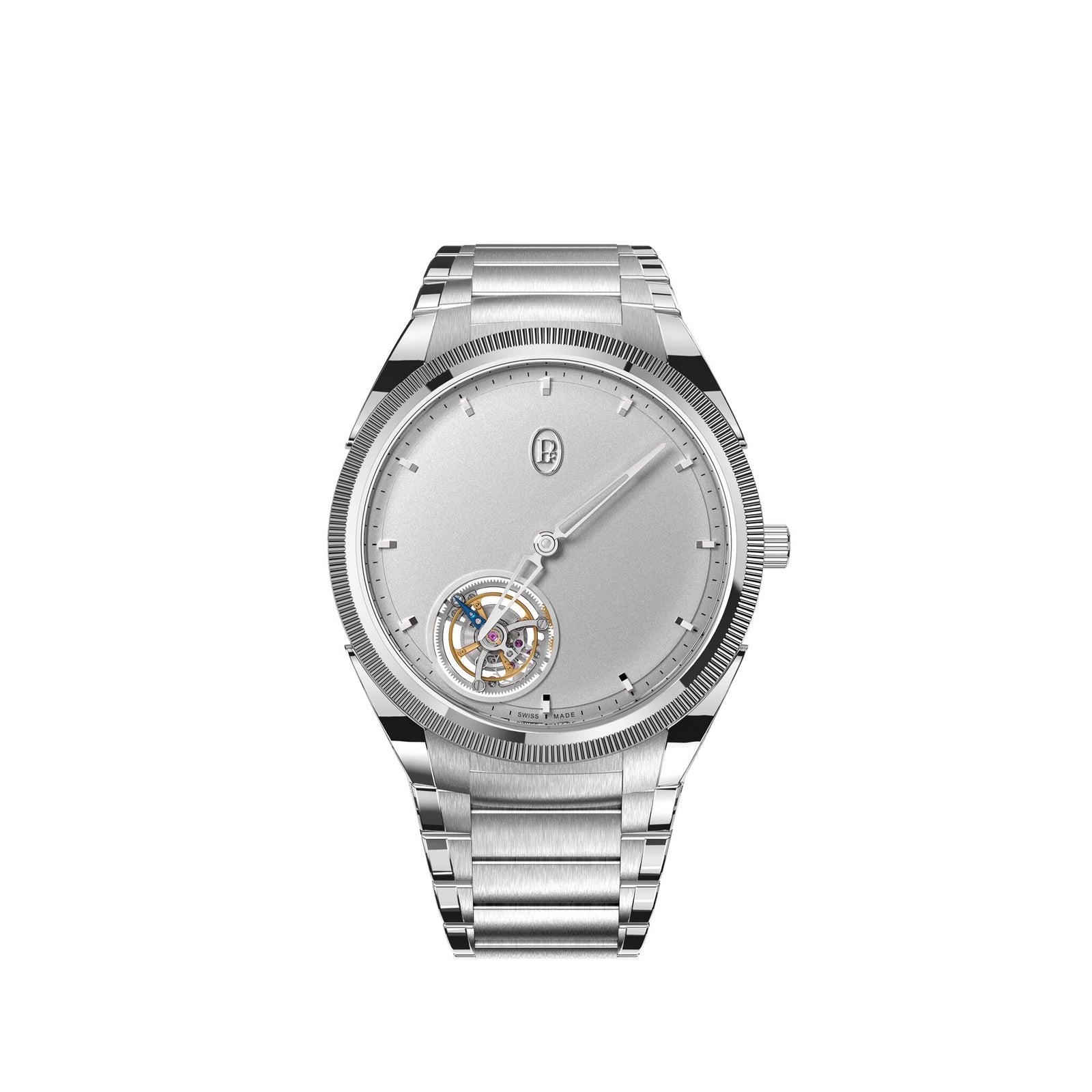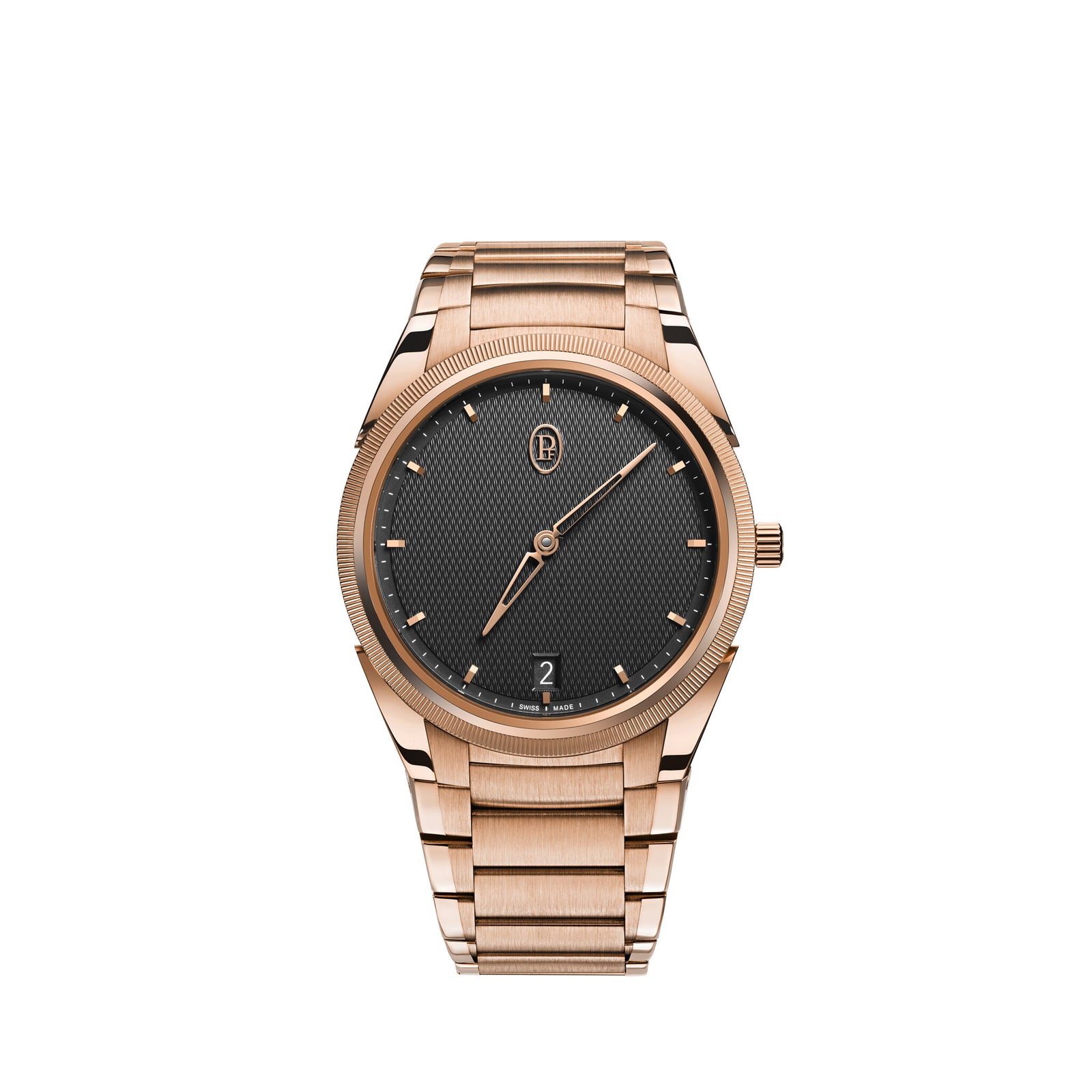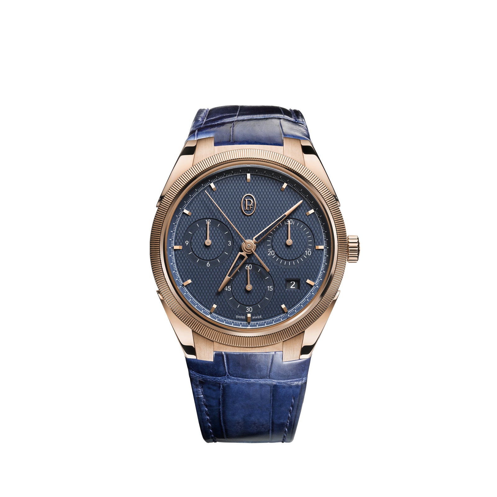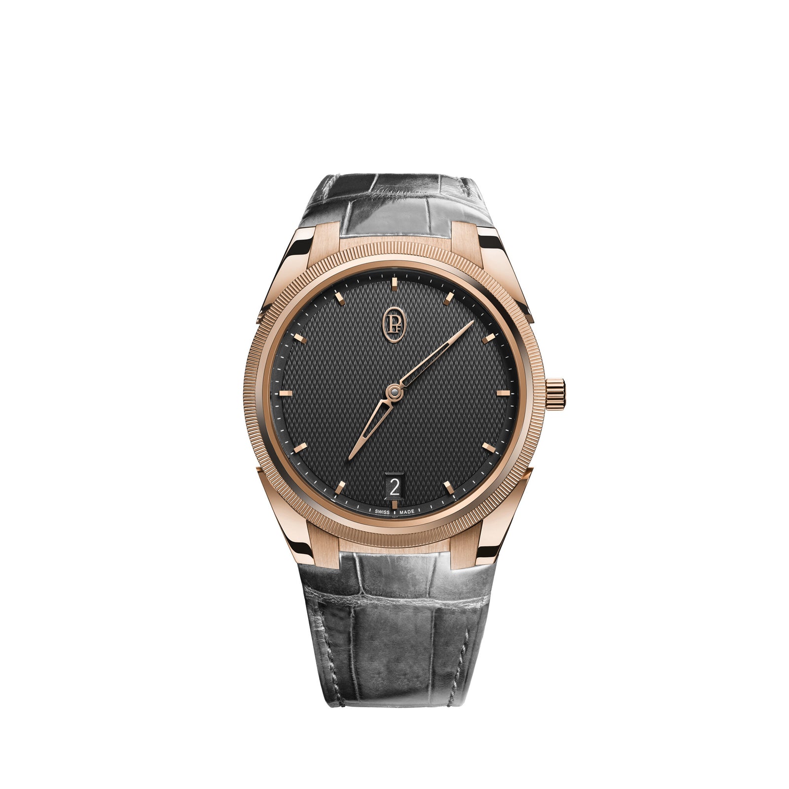 • 男士腕表,采用自动机芯,钢制银色表壳,配抛光表圈与蓝宝石玻璃,灰色表盘配时标。具计时、日期、偏心秒针和防水 100,红色橡胶表带配折叠扣。