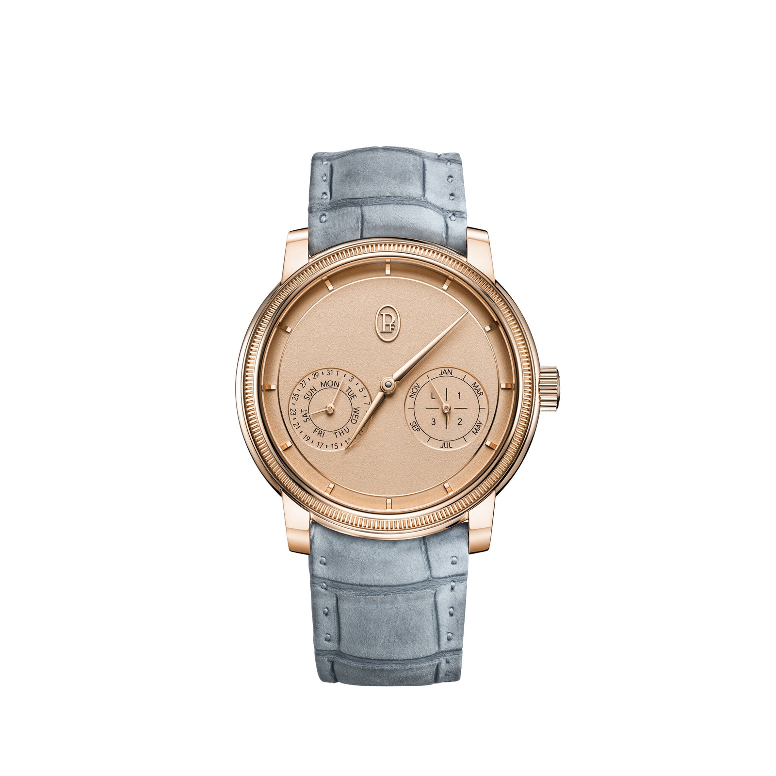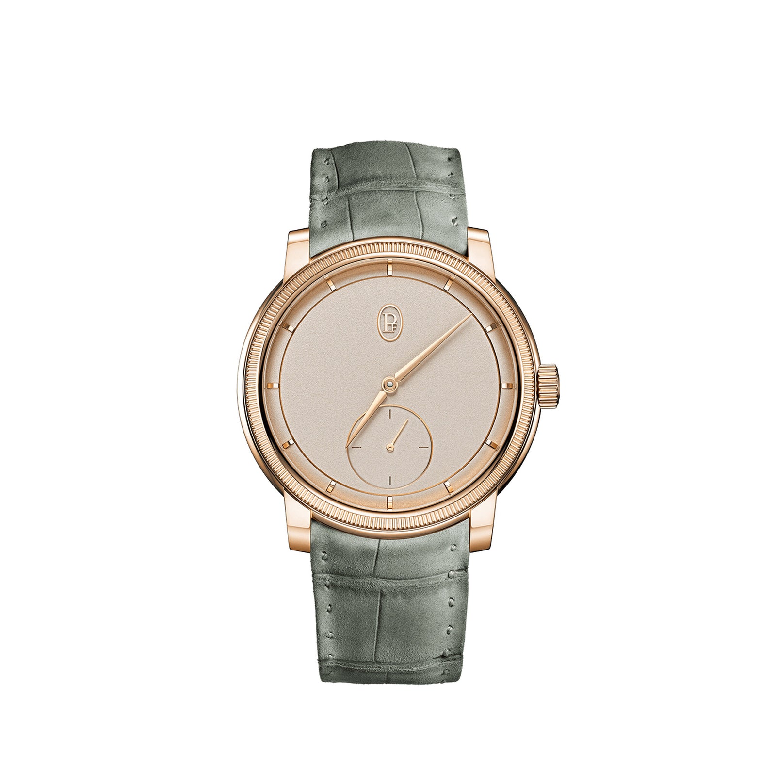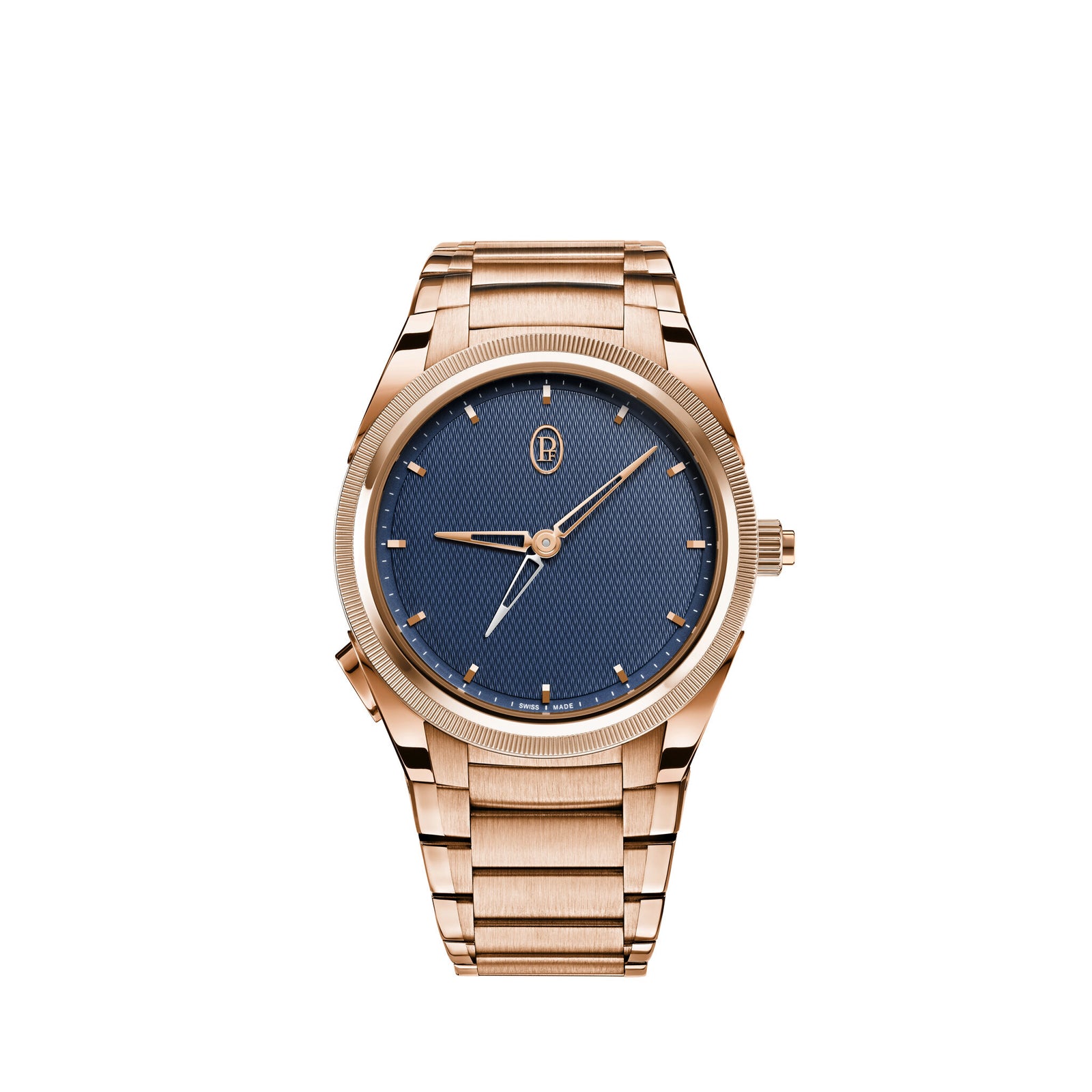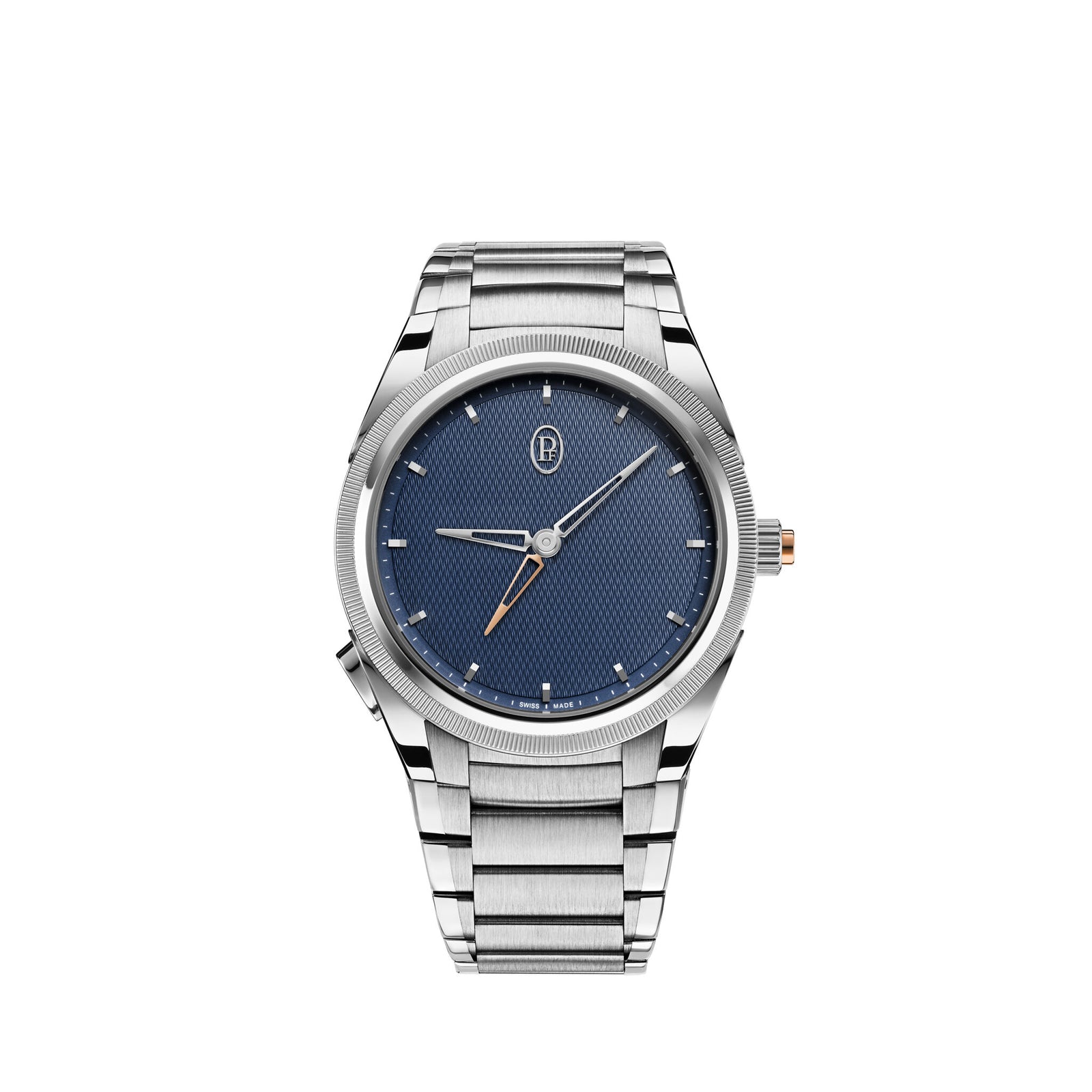 • 男士腕表,采用自动机芯,钢制银色表壳,配抛光表圈与蓝宝石玻璃,灰色表盘配时标。具计时、日期、偏心秒针和防水 100,红色橡胶表带配折叠扣。