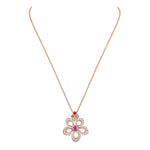 • 这款玫瑰金项链将精湛工艺与鲜明的色彩点缀结合:中央镶一颗 0,76 ct 的粉色弧面形切割蓝宝石,旁衬 45 颗明亮式切割钻石(平均 0,323 ct),布局由单颗圆形蓝宝石补充:紫色(1 × 0,087 ct)、橙色(圆形:1 × 0,075 ct;其他橙色蓝宝石:1 × 0,081 ct)和黄色(1 × 0,136 ct),为作品增添层次与光彩。