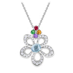 • Blütenblatt 项链以白金制作,中央为一颗浅蓝色海蓝宝石,弧面形切割 (0.56 ct);并配有1颗橙色、圆形曼陀林石榴石 (0.104 ct)、45颗明亮式切割钻石 (8.244 ct)、1颗紫色、圆形紫水晶 (0.089 ct) 和1颗绿色、圆形绿色石榴石 (0.228 ct),为精致的设计增添生动的色彩点缀与闪耀光彩。