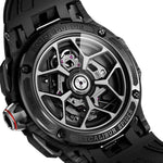 • 男士腕表,搭载自动上链机芯,机芯型号 RD780;黑色碳纤维表壳,带测速表圈和蓝宝石玻璃;镂空表盘,带刻度和偏心秒针,无日期显示;黑色橡胶表带,折叠表扣;防水 100。