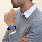 • 钢制男士腕表,搭载自动上链机芯(ELITE机芯),中央秒针;表圈抛光、表面为银色,蓝色表盘配阿拉伯数字且无日历窗,蓝色皮表带配针扣,防水 100。