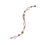 这款玫瑰金手链汇集了一组生动的彩色宝石:3枚紫色弧面形切割紫水晶 (4.218 ct)、3枚粉色弧面形切割碧玺 (2.463 ct)、3枚紫色圆形蓝宝石 (0.448 ct)、3枚黄色圆形蓝宝石 (0.51 ct)、1枚绿色圆形碧玺 (0.09 ct)、2枚粉色圆形蓝宝石 (0.29 ct)、69枚明亮式切割钻石 (0.985 ct)、2枚绿色弧面形切割碧玺 (1.457 ct)、69枚各类宝石 (9.72 ct) 及1枚橙色圆形蓝宝石 (1.14 ct),共同构成和谐的色彩组合。
