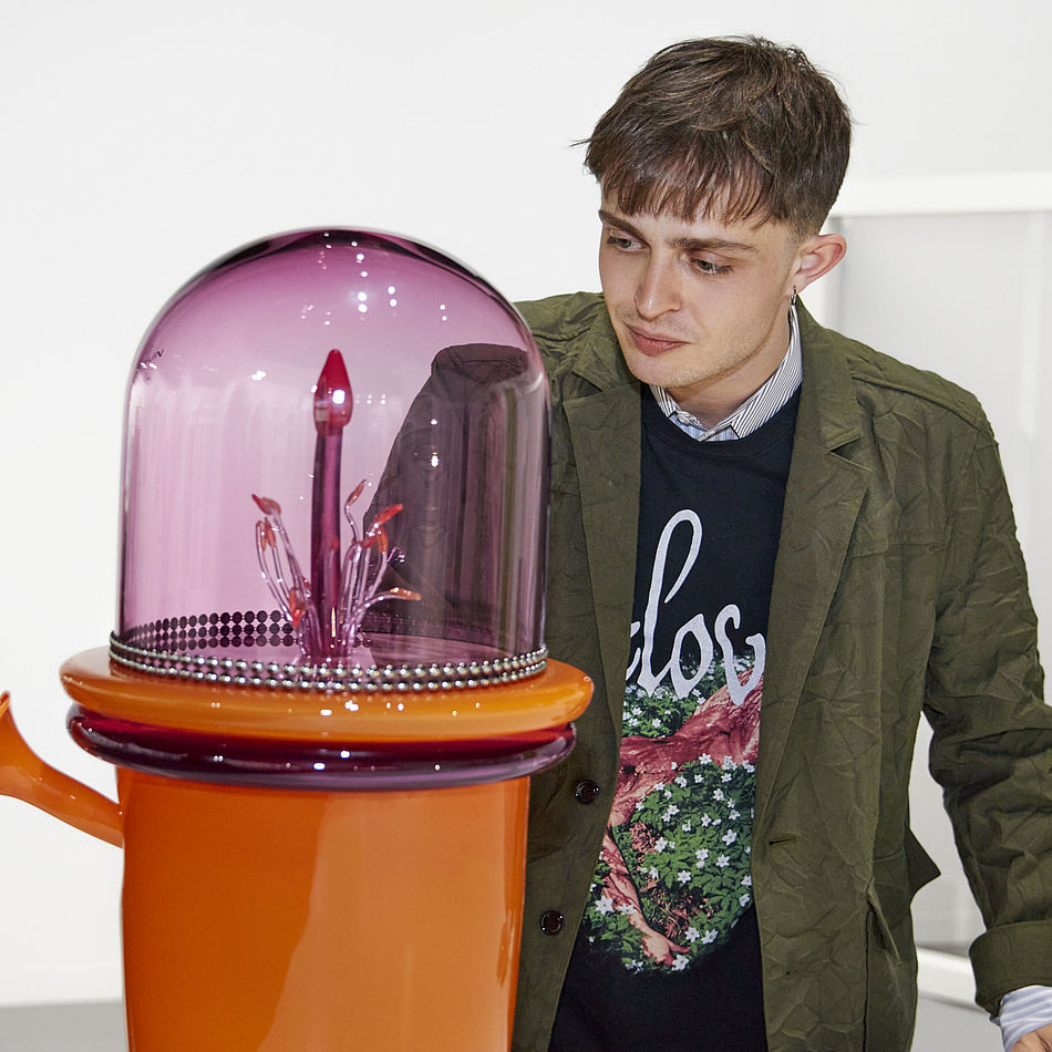 Der Künstler Thomas Liu Le Lann stellt seine Glasskulptur "Before Shade and Indifference; Kunstbot IV; Aurora Capsule" vor, die wie seine drei zuvor entstandenen Kunstbot-Skulpturen aus Glas geblasen wurde und sich von den 1980er Jahren in Form von Weltraumrobotik inspirieren liess. Mit seiner Kunst reduziert er den Ausdruck eines technischen Objekts und dessen Unfähigkeit, als solches zu funktionieren, auf einen formalistischen Aspekt. Die Farben des Kunstobjekts, ein durchscheinendes Rosa und ein opakes Orange, wurden von demselben seltenen Padparadscha-Saphir inspiriert, der auch für unser Meisterwerk "Flaming Grace" als Inspiration diente.