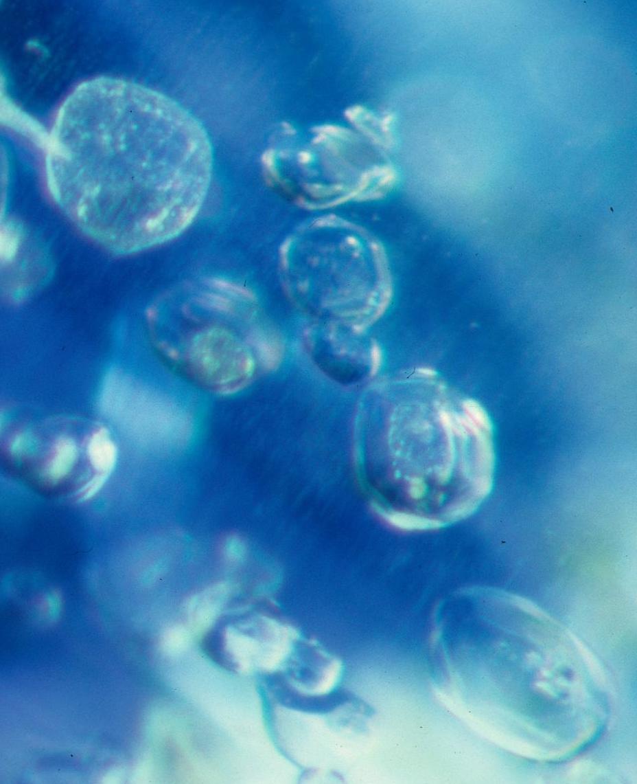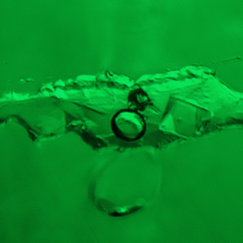 Die sogenannten Dreiphaseneinschlüsse, wie abgebildet, bestehen aus Gasblasen, Flüssigkeiten und kristallinen Strukturen, die alle in den wachsenden Edelstein eingeschlossen wurden. Diese Einschlüsse finden sich typischerweise in Smaragden aus Kolumbien wieder. Sie entstehen zu Beginn oft als ein rein flüssiger Einschluss einer salzigen Flüssigkeit während der Entstehung des Wirtminerals. Bei Abkühlung des Kristalls lösen sich die Minerale und Gase aus der Flüssigkeit und bilden so diese komplexen Muster.