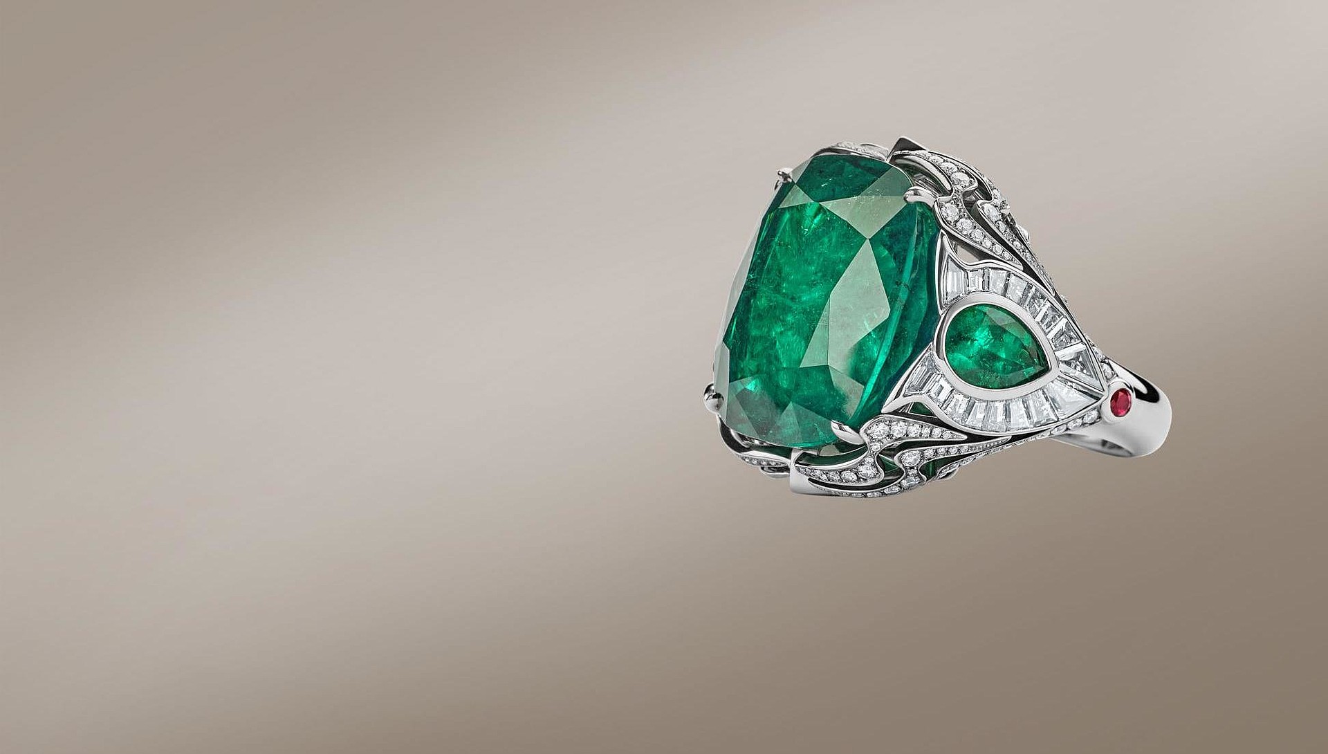 Der Blick in die Tiefen eines Smaragds eröffnet zarte, zierliche Formen, welche Blättern und Blüten einer exotischen Pflanze gleichen. Geheimnisvolle Kurven und mysteriöse, schnabelähnliche Silhouetten haben unsere talentierten Designer an eine Paradiesvogelblume erinnert. Die Strelitzie, wie sie auch genannt wird, gehört zu den raffiniertesten tropischen Blumen und gilt als Symbol für Freiheit und Wohlstand.