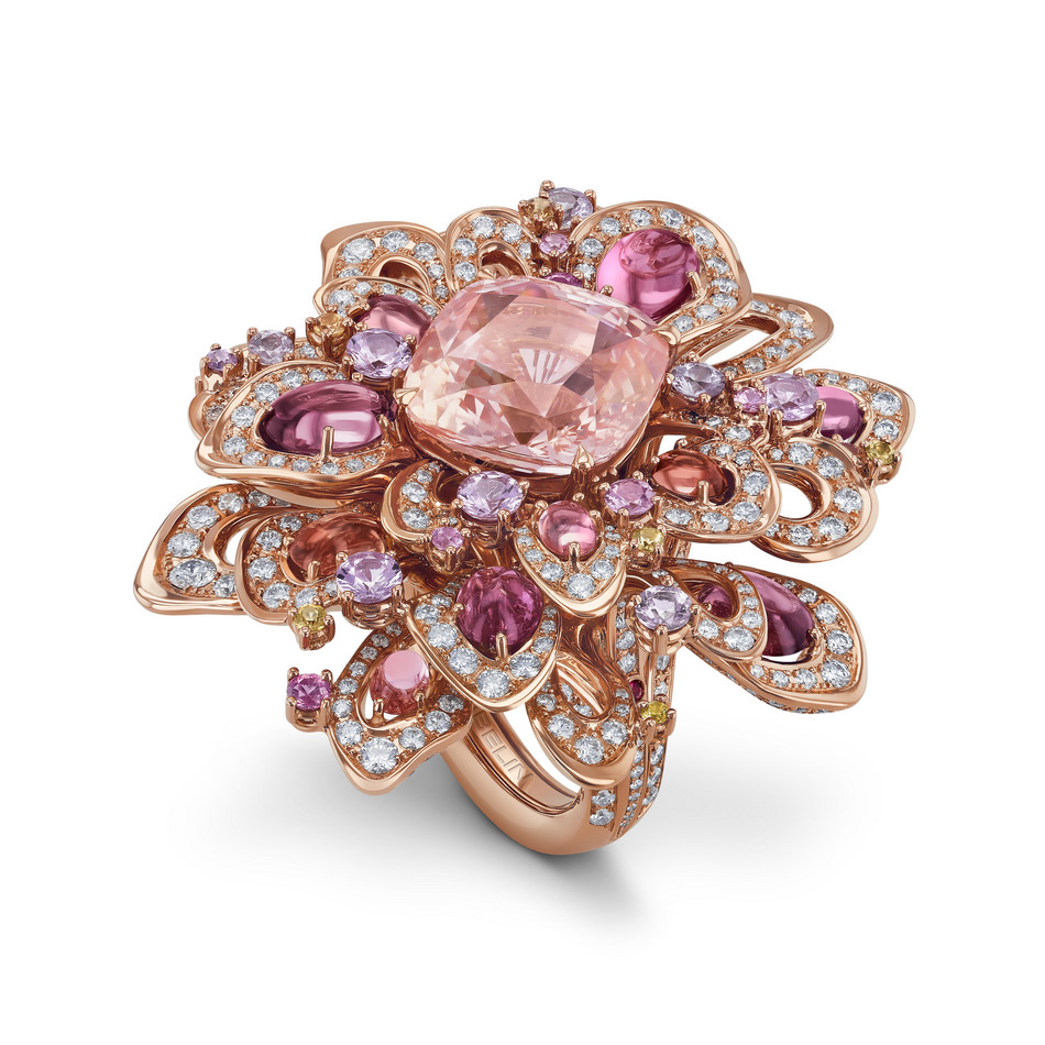 Das Meisterwerk «Rising Lotus» aus Rotgold präsentiert einen traumhaften Padparadscha-Saphir aus Sri Lanka von 14.25 ct, 14 Saphire im Cabochonschliff und 25 runde Saphire sowie funkelnde Diamanten. Der Ring ist eine Ode an die Spiritualität und Anmut der eleganten Lotusblüte.