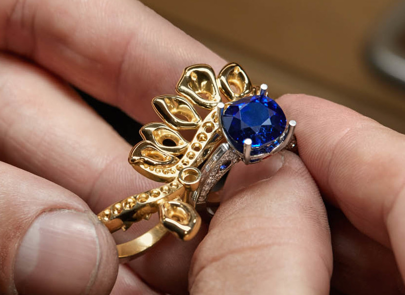 Der skulpturale Cocktailring besteht aus einem klassischen Solitärring aus Platinum sowie einem kreativen Two-Finger-Ring aus Gelbgold. So ermöglicht der Schmuck gleich drei unterschiedliche Tragarten: als Cocktailring, der die beiden Ringe kunstvoll kombiniert, als klassischer Saphir-Solitärring oder als einzelner getragener, moderner Two-Finger-Ring. Dieses wertvolle Schmuckstück wurde von kreativen Designern, Goldschmieden und Edelsteinfassern mit grösster Sorgfalt und Liebe zum Detail entworfen und gefertigt.