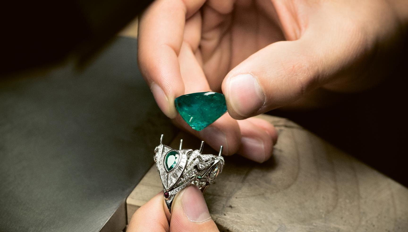Jeder einzelne farbige Edelstein und Diamant, in manchen Schmuckstücken sind es deren tausende, wird von unseren hochqualifizierten Edelsteinfassern von Hand eingesetzt und mechanisch fixiert. Diese Aufgabe erfordert äusserste Präzision und Sachkenntnis. Jeder Fehler birgt die Gefahr, die Edelsteine unwiederbringlich zu beschädigen, was für das entstehende Schmuckstück fatale Folgen hätte. Der Moment, in dem der Hauptstein, die Quelle der Inspiration und der Blickfang der Kreation, an seinem vorgesehenen Platz eingesetzt wird, ist wahrlich einzigartig.