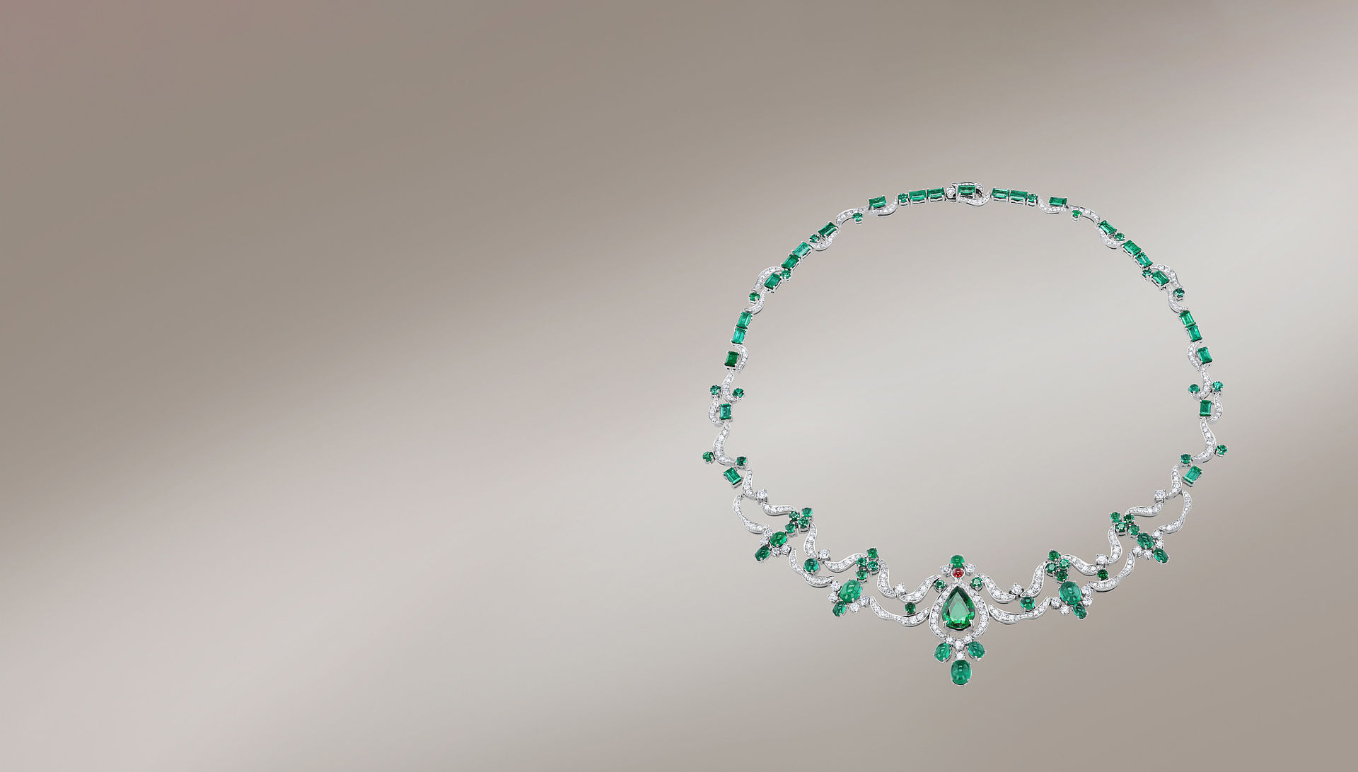 The designers translated their inspiration into sinuous elements set with, brilliant-cut diamonds, which emulate not only the structures contained within the emerald but also the dunes in Brazil, the country where the emeralds used in this necklace were mined. The centrepiece of the necklace is a sparkling pear-shape emerald surrounded by a diamond entourage, above which the iconic Gübelin Jewellery ruby seems to float.