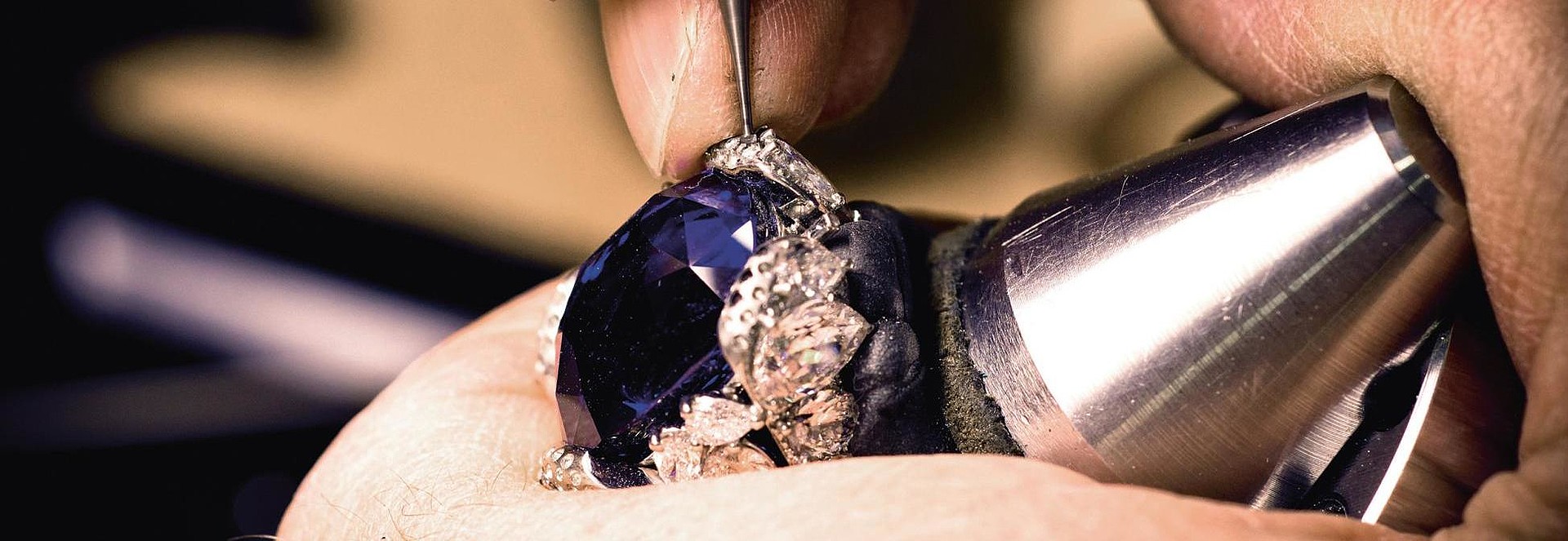 The last of the 174 fine brilliant-cutdiamonds are set, surrounding the intriguing sapphire at the centre of this masterpiece.