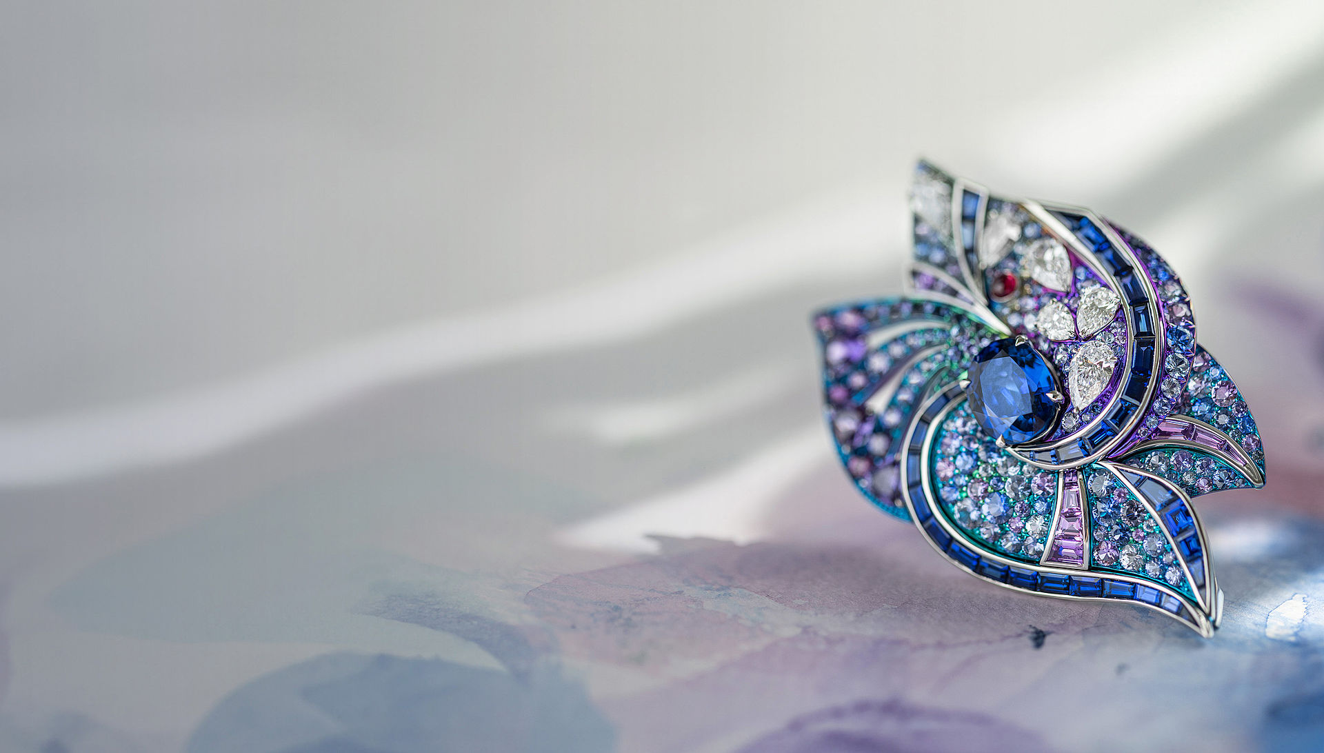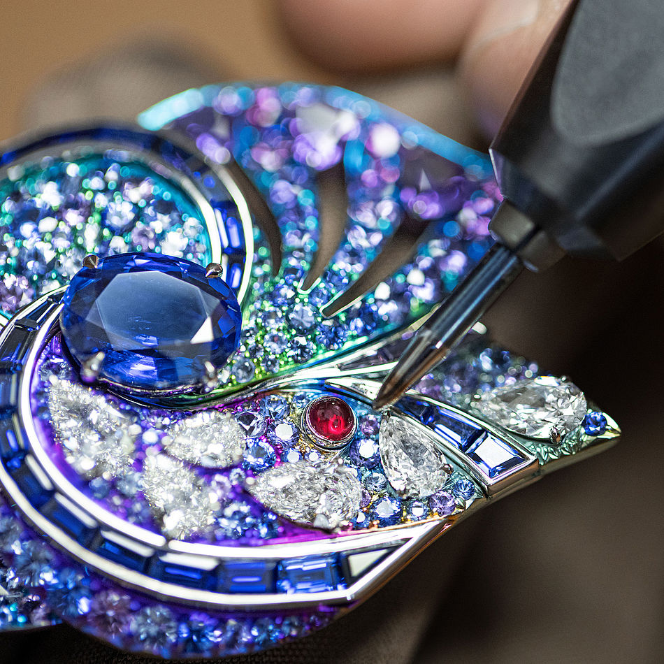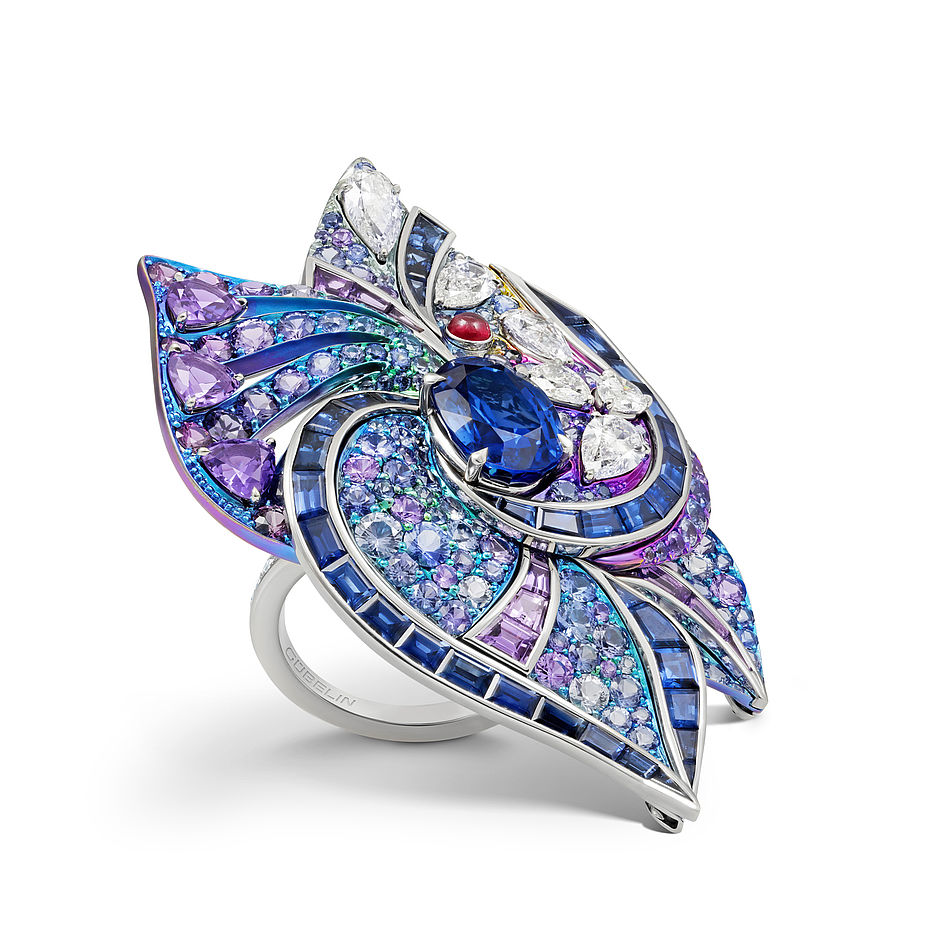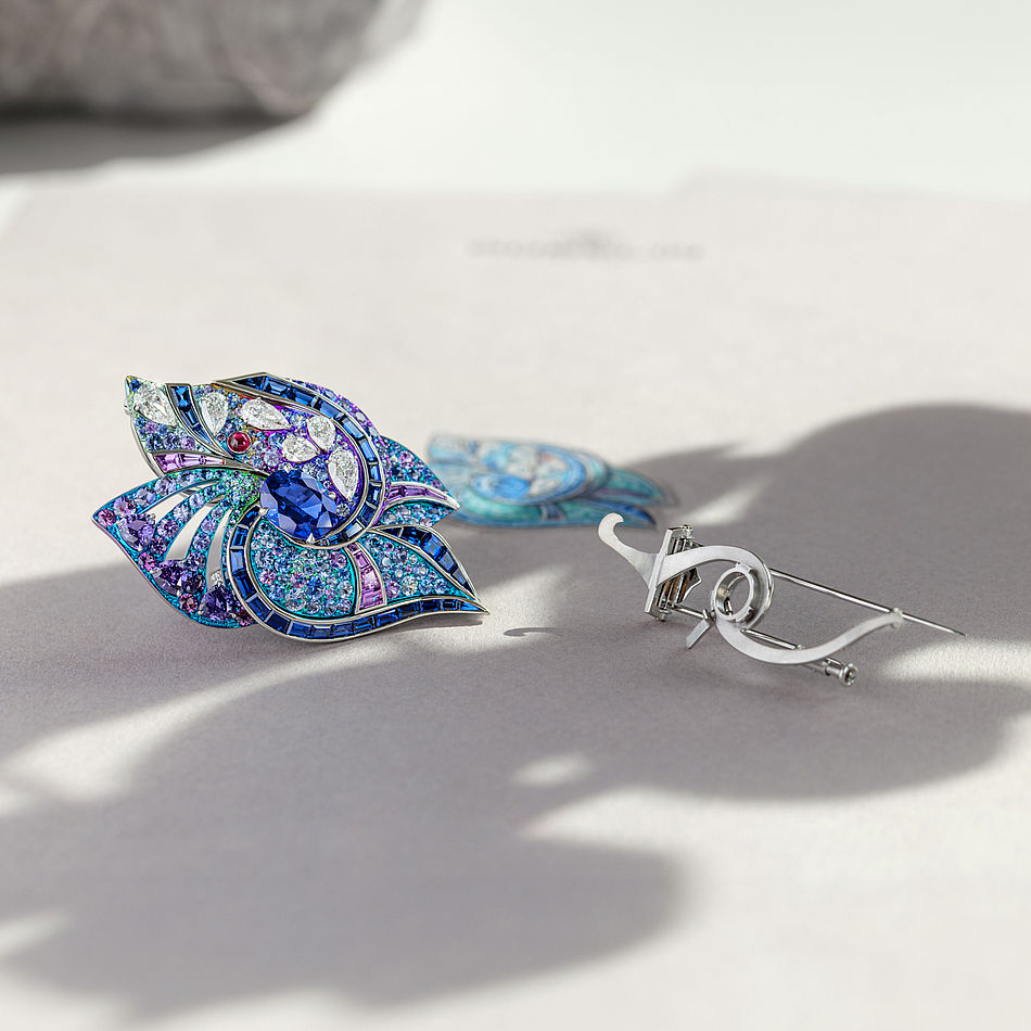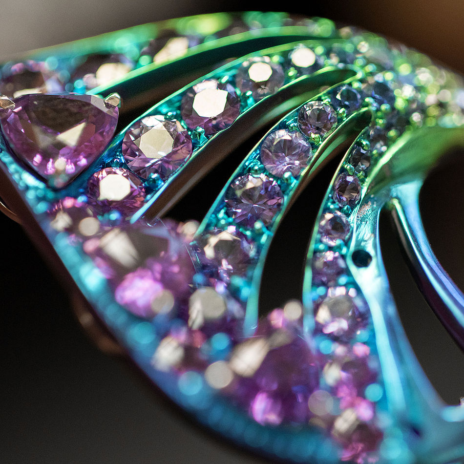 Crafted in titanium featuring a play of iridescent colours and platinum, this haute joaillerie piece is a homage to the lightness and brightness of the ethereal creature. The designers chose titanium to create stunning colour effects.