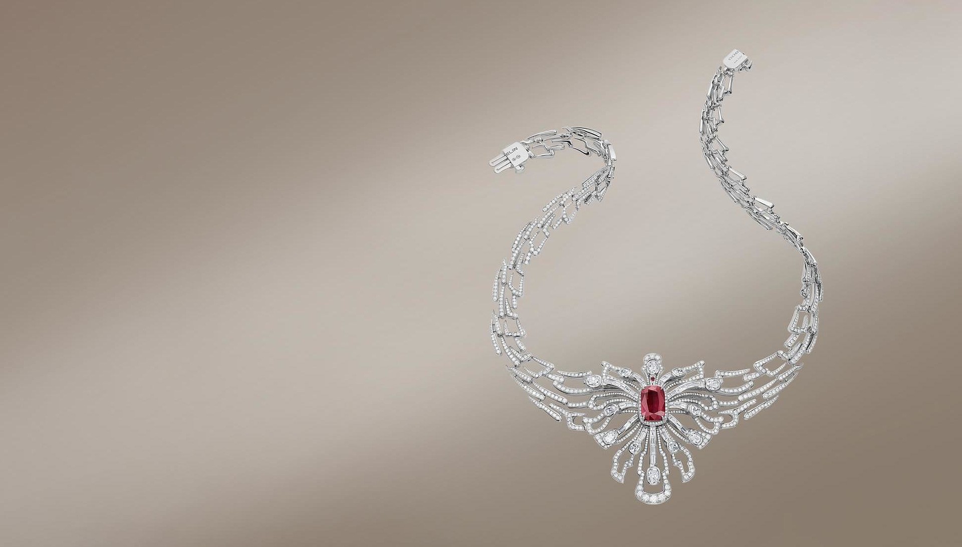 For the Wings of a Dragonfly necklace, our skilled Gübelin Jewellery designers let the Burmeseruby reveal the riches of its inner world. The depths of the gemstone hold a unique secret, the stone’s inclusions presenting a vast array of mesmerising, cell-like patterns. Elegantly arched, the fanned pattern evokes the imagery of the intricate and delicate structure of a dragonfly's wings.