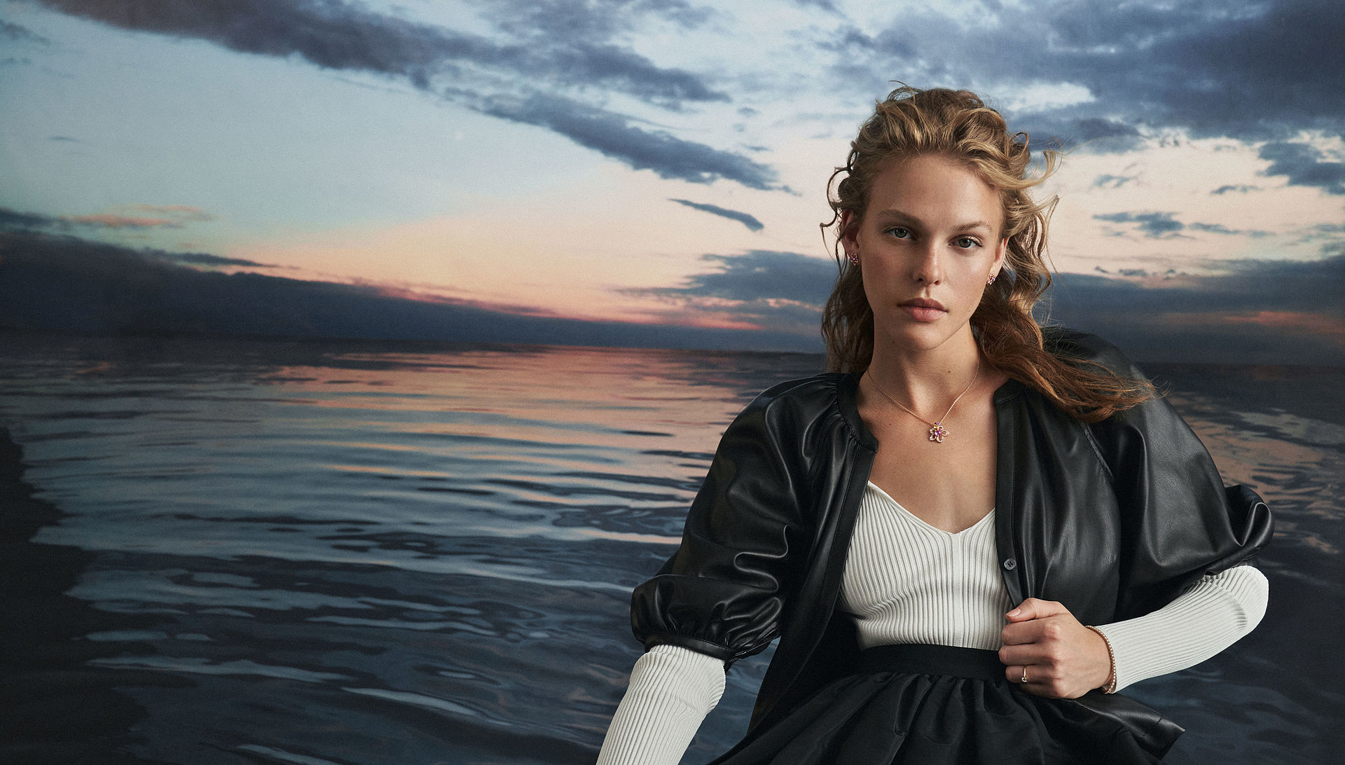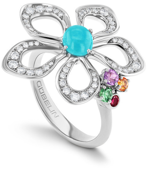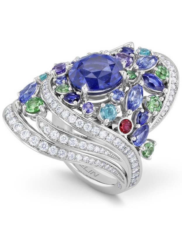 White gold ring with one oval sapphire totaling 4.46 ct, six pear-shaped sapphires totaling 0.67 ct, four marquise-cut sapphires totaling 1.00 ct, seven round sapphires totaling 0.66 ct, three round Paraiba tumalines totaling 0.24 ct, seven green round tsavorites totaling 0.63 ct , a green marquise-cut tsavorite of 0.05 ct and 220 brilliant-cut diamonds totaling 1.21 ct.