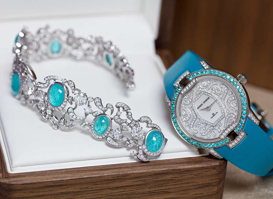 In 2016, the House of Gübelin and the Geneva manufactory of Roger Dubuis jointly presented delightful creations based on Paraiba tourmalines. Gübelin found inspiration for its “Grace of the Sea Anemone” line from the inner world of a divine Paraiba tourmaline. In keeping with this theme, Roger Dubuis created the “Velvet Paraiba” watch, incorporating the fluid forms of the jewellery. Due to popular demand, Roger Dubuis has now created a new edition of this graceful timepiece. This new version is limited to 8 pieces and currently displayed in selected Gübelin boutiques.