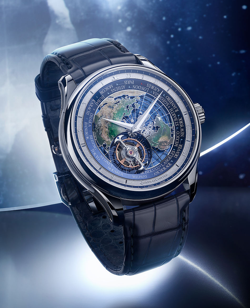 Combining both extraordinary artistry and the highest precision of mechanical watchmaking, this newest creation fresh from Jaeger-LeCoultre's famous manufacture is a true marvel of watchmaking. Highly complex, this timepiece blends the Universal Tourbillon with a world-time complication that, in its sheer visual beauty, is one-of-a-kind. It takes the highly skilled and experienced artists in the manufacturer's ateliers more than seventy hours to create the intricate dial, created from white gold and employing Champlevé, an ancient enamelling technique. Seen from the North Pole, the continents of our planet rise up from the deep blue ocean, delicately symbolising the function of the world-time complication. It seems inevitable that travel enthusiasts and timepiece aficionados from all over the world will wish to see this rare piece of the watchmaker's art on their wrist in the near future.