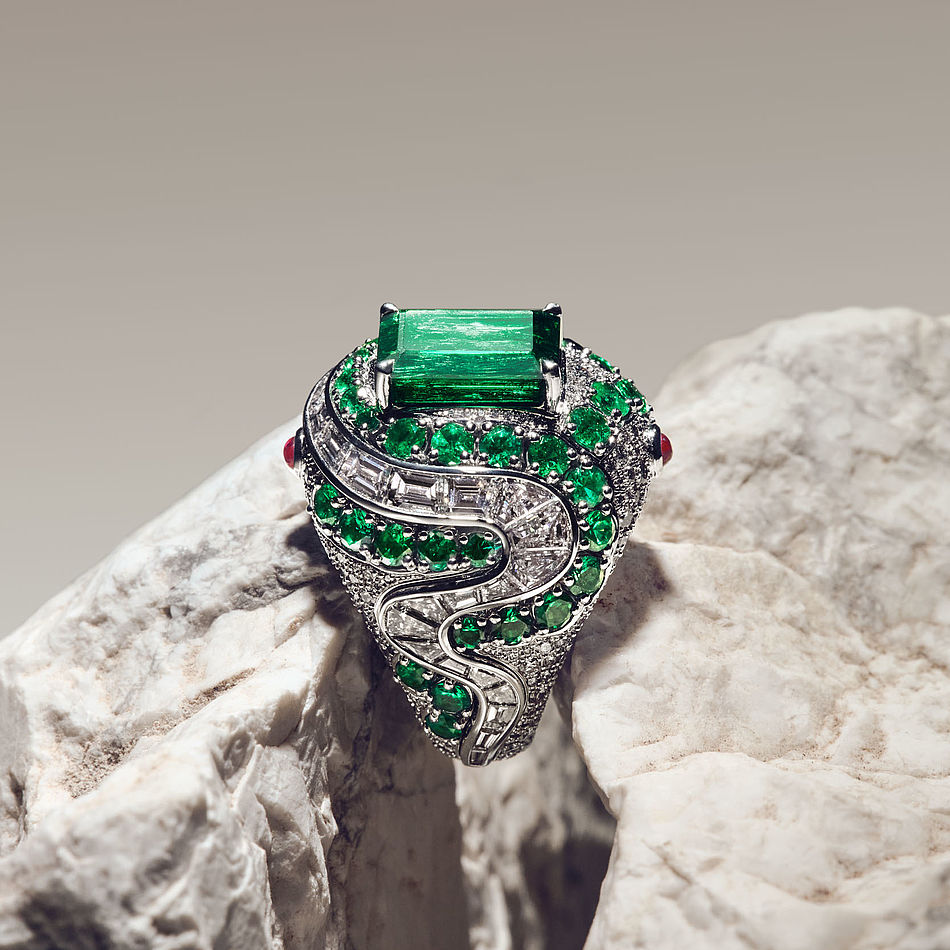 古宝琳的流波滴翠鸡尾酒戒指是一件真正的杰作。 这件精心制作的白金珠宝在公司位于卢塞恩的工作室耗费了 300 多个小时。 主石是产自巴西的八角形祖母绿,重达 5.28 克拉,另外还有 48 颗总重 3,070 克拉的圆形祖母绿、38 颗总重 3.23 克拉的长方形钻石和 244 颗总重 1.52 克拉的明亮式切割钻石。