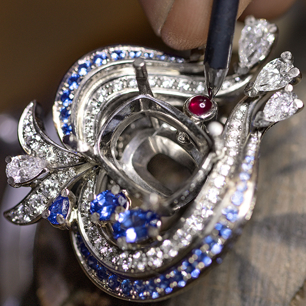 对于标志性的红宝石,古宝琳选择了一个显眼的位置。弧面形切割的红宝石仿佛直接漂浮在中心宝石的旁边。红宝石周围是镶嵌梨形钻石的弧形元素。红宝石象征着古宝琳家族 Deeply Inspired 的理念,体现了古宝琳家族对彩色宝石的热情。在蓝宝石和钻石的精致排列中,红宝石还增添了令人兴奋的红色闪光,彰显了古宝琳珠宝的独特魅力。