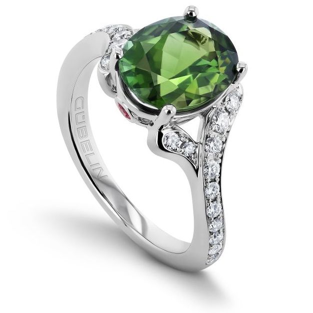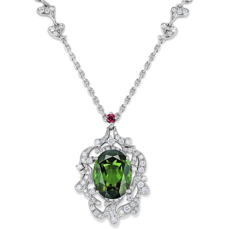 The talented Gübelin Jewellery designers translate the unique vistas into a mesmerizing jewel, which reflects the motion of the sea and life within it. This extraordinary white gold necklace features a captivating Green Oval Tourmaline, weighing 4.48 carats, and is adorned with 107 brilliant-cut diamonds totaling 0.86 carats.