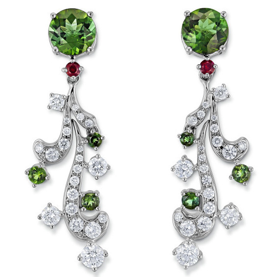 Droplets, splashes and the lively hues of greens are merged to great effect, resulting in an intricate design of exceptional beauty. Adorned with eight round Green Tourmalines totaling 2.03 carats and 40 brilliant-cut diamonds totaling 0.76 carats, these white gold earrings exude natural beauty and captivating brilliance.
