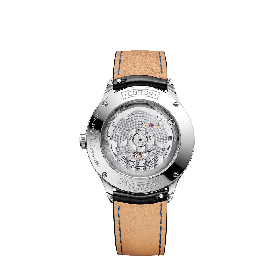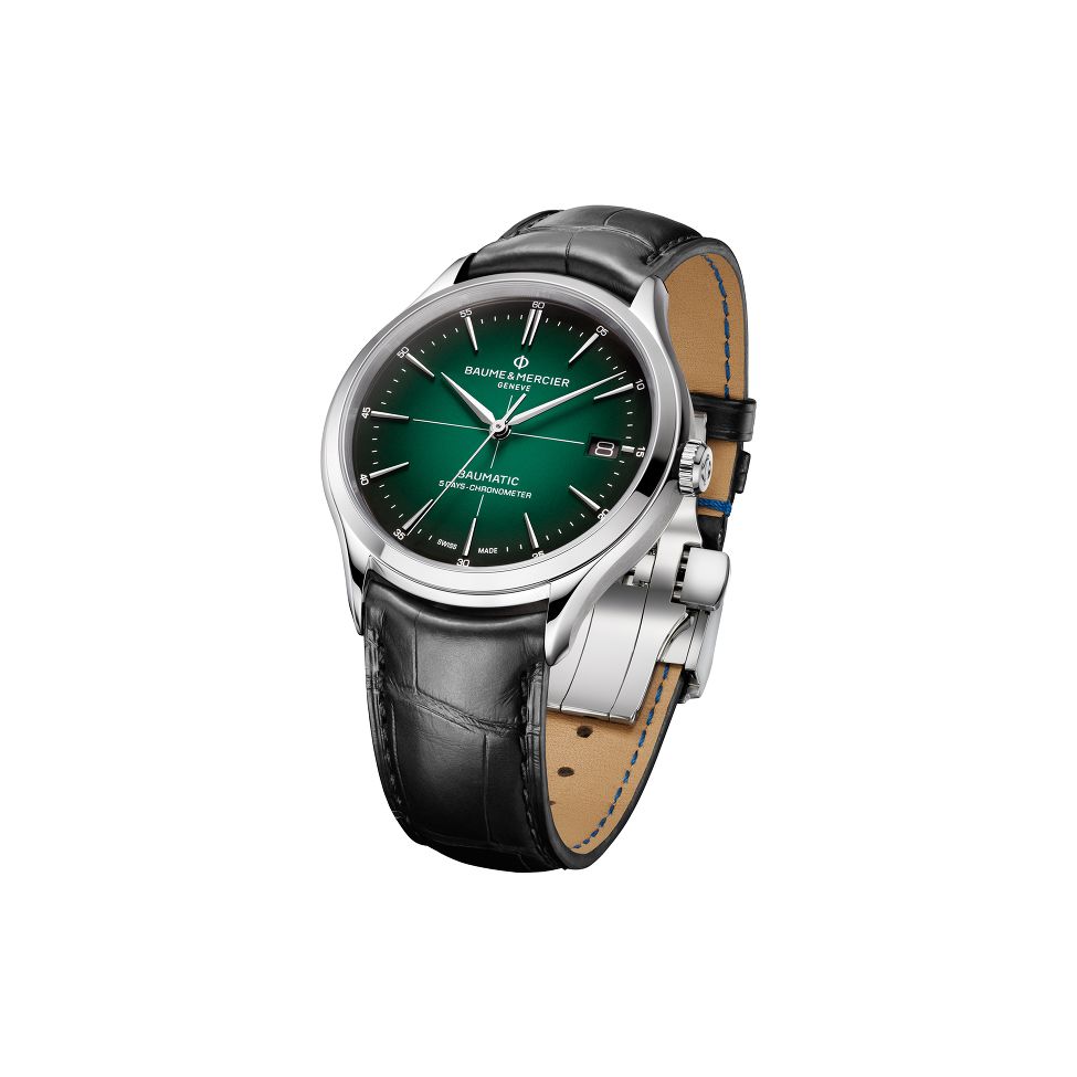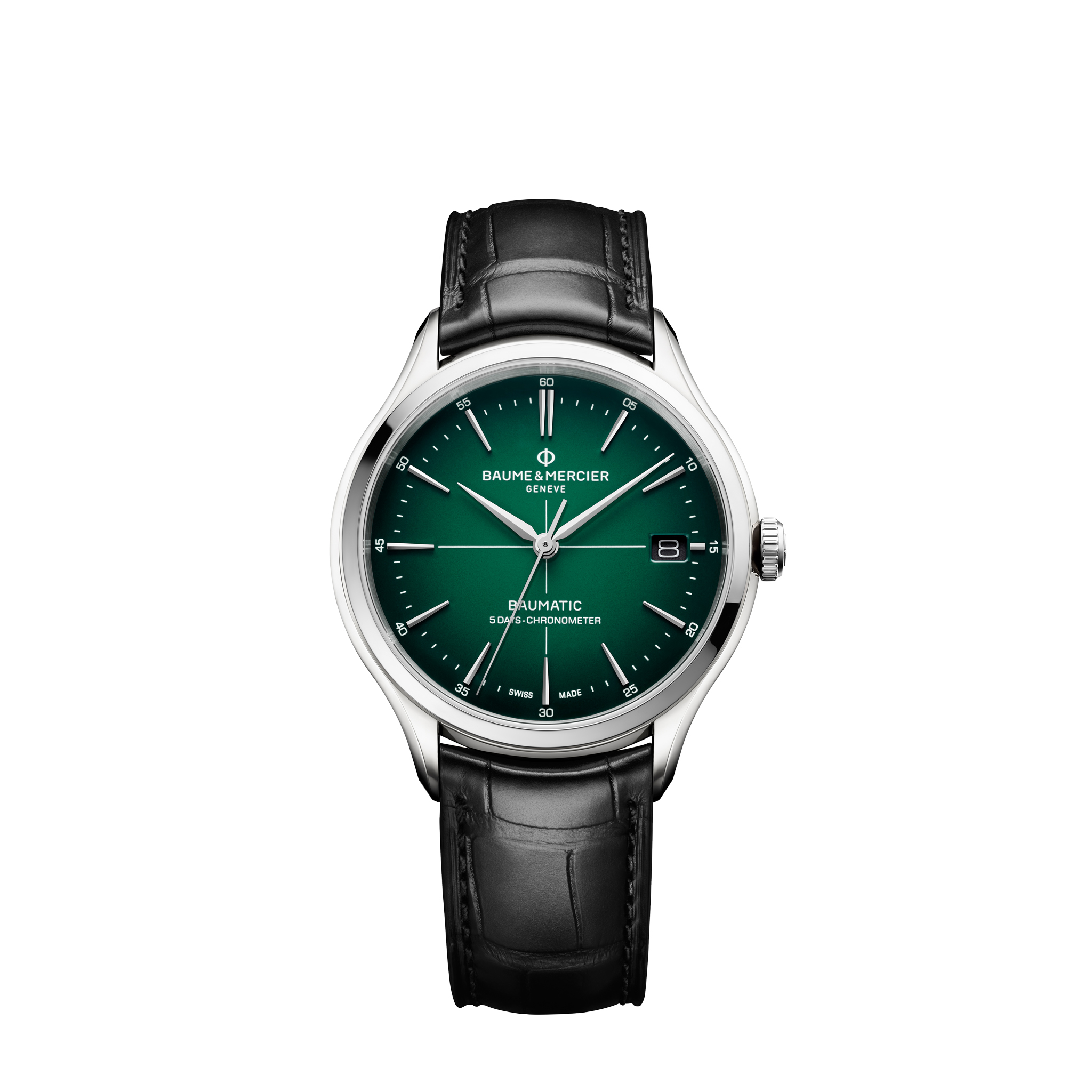 Die Clifton Baumatic™ feiert moderne Eleganz. Das polierte 40 mm Edelstahlgehäuse präsentiert das grün lackierte Zifferblatt mit einem weissen Fadenkreuz, rhodinierten Indizes und Zeigern. Die Datumanzeige liegt auf drei Uhr. Der transparente Gehäuseboden gibt den Blick auf das Swiss Made Uhrwerk frei. Ein schwarzes Alligator Lederarmband verleiht der Uhr den letzten Schliff.