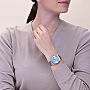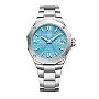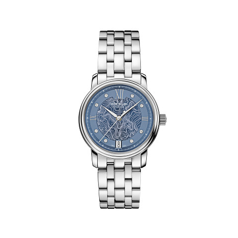 Die Baume & Mercier Riviera zollt der bekannten französischen Küste Tribut mit einem einzigartig gestalteten Zifferblatt, das an das Meer und die Berge erinnert. Das Edelstahlgehäuse ist mit einer zwölfseitigen Lünette versehen. Auf dem azurblauen Zifferblatt ergänzen römische Ziffern und rhodinierte Dauphine Zeiger eine Datumanzeige. Der Zeitmesser wird von einem Swiss Made Quarzwerk angetrieben und ist bis 50 Meter wasserdicht. Ein Edelstahl Gliederarmband mit Fast Strap System rundet die Uhr ab.
