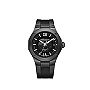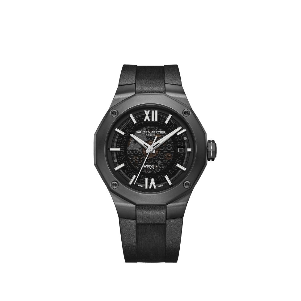 Mit der ganz in Schwarz gehaltenen Riviera präsentiert Baume & Mercier einen zugleich sportlichen und raffinierten Zeitmesser. Das schwarze ADLC Edelstahlgehäuse ist mit einer zwölfseitigen Lünette versehen. Auf dem rauchgrauen Saphirglaszifferblatt werden die römischen Ziffern und die rhodinierten Dauphine Zeiger durch eine Datumanzeige ergänzt. Der transparente Gehäuseboden ermöglicht den Blick auf das Automatikwerk. Der Zeitmesser ist bis 100 Meter wasserdicht. Ein auswechselbares schwarzes Kautschukarmband rundet die Uhr ab.