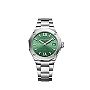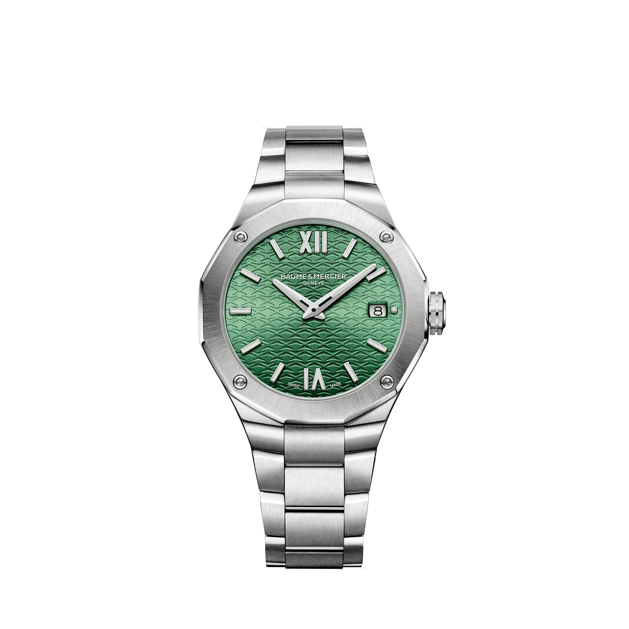 Baume & Mercier präsentiert mit den neuen Modellen der Riviera Kollektion eine feminine Variante im Durchmesser von 36 mm. Die bekannte zwölfseitige Lünette wird auf dem Edelstahlgehäuse mittels vier Schrauben fixiert. Auf dem grün gemusterten Zifferblatt ergänzen römische Ziffern und rhodinierte Dauphine Zeiger die Datumanzeige. Der Zeitmesser wird von einem "Swiss Made"-Automatikwerk angetrieben und ist bis 50 Meter wasserdicht. Ein poliertes Edelstahlarmband rundet die Uhr ab.