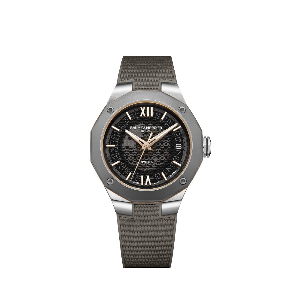 Anlässlich ihres 50-jährigen Jubiläums feiert die Riviera im Jahr 2023 ein großes Comeback. Die neue Riviera fasziniert mit einem schlanken 39 mm Gehäuse aus poliertem Stahl, das seinen typischen zeitlosen, sportlich-schicken Look beibehält. Die bekannte zwölfeckige Lünette aus sandgestrahltem Titan ist mit vier Schrauben befestigt und wird durch einen vergoldeten Stahlring ergänzt. Das transparente, rauchgrau dekorierte Saphirzifferblatt wird durch goldfarbene römische Ziffern und Dauphine-Zeiger sowie eine Datumsanzeige bei drei Uhr ergänzt. Der transparente Gehäuseboden gibt den Blick auf das hauseigene Automatikwerk frei, das eine beeindruckende Gangreserve von 120 Stunden bietet. Ein schwarzes Kautschukarmband rundet die Uhr ab.