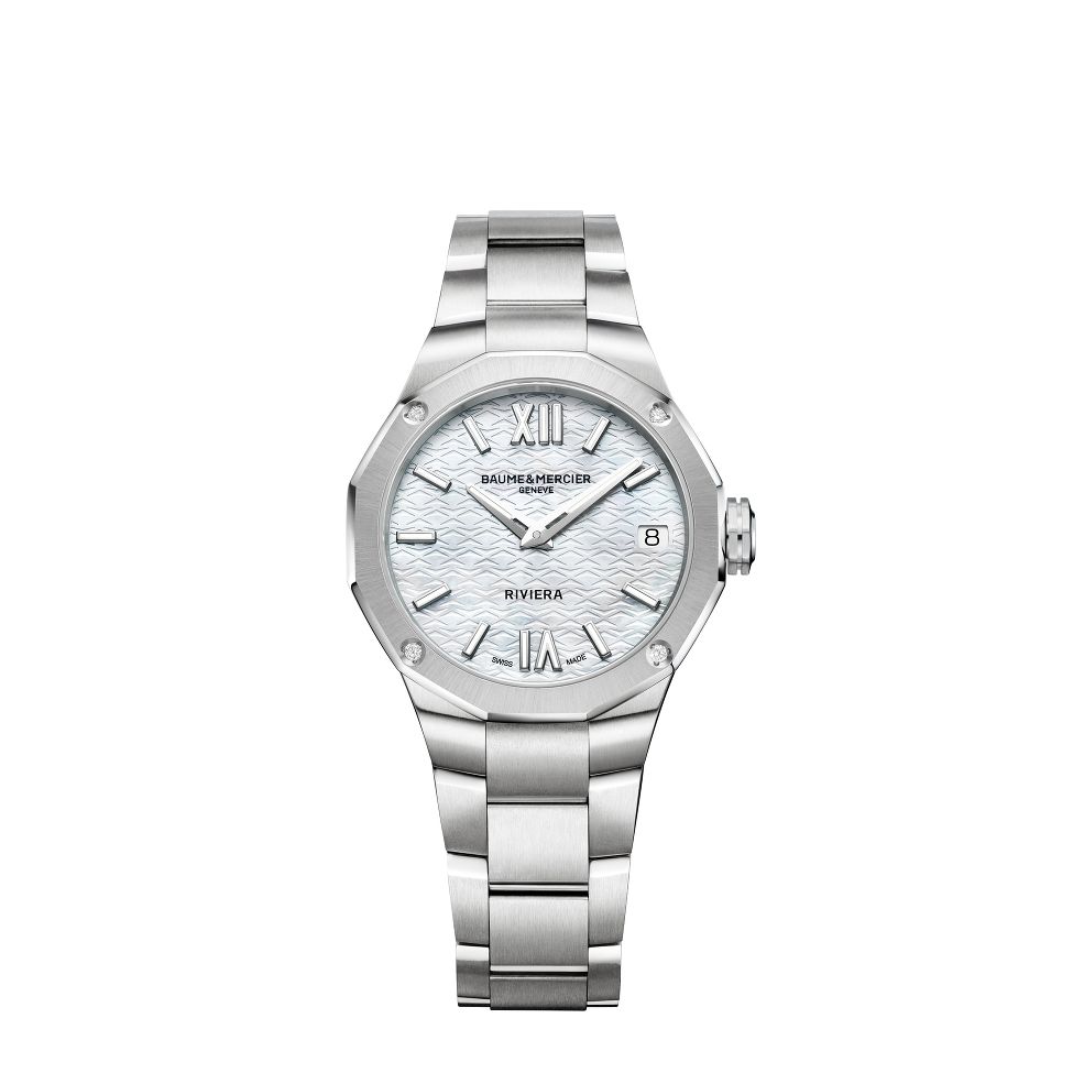 Diese 33-mm-Riviera, angetrieben von einem Schweizer Quarzwerk, verfügt über ein Zifferblatt aus Perlmutt, verziert mit vier Diamanten und einem eleganten Metallarmband. Die Uhr strahlt Eleganz aus mit römischen Ziffern, leuchtenden Indizes und rhodinierten Zeigern. Ein diskretes Datumsfenster bei 3 Uhr rundet das Design ab.