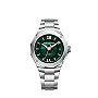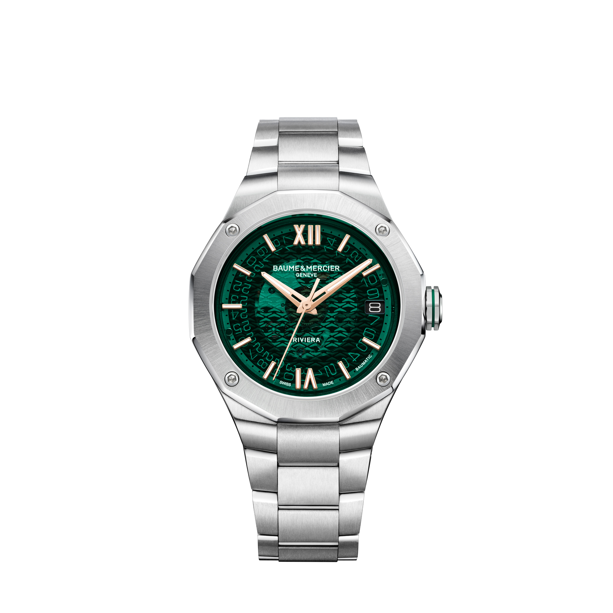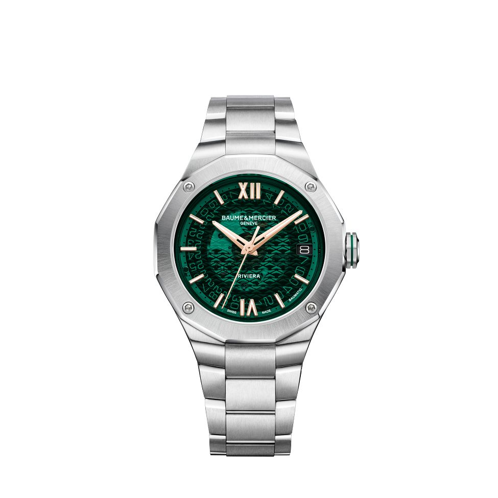 Die Baume & Mercier Riviera M0A10770 ist eine Herrenuhr mit Automatikwerk und einem 39-mm-Edelstahlgehäuse. Sie verfügt über ein grünes Zifferblatt und ein Saphirglas. Zu den Funktionen gehören eine Datumsanzeige und ein Glasboden. Das silberne Edelstahlarmband wird mit einer Faltschliesse gesichert. Angetrieben durch ein Schweizer Automatikwerk, bietet die Uhr eine Wasserdichtigkeit von 100 Metern.