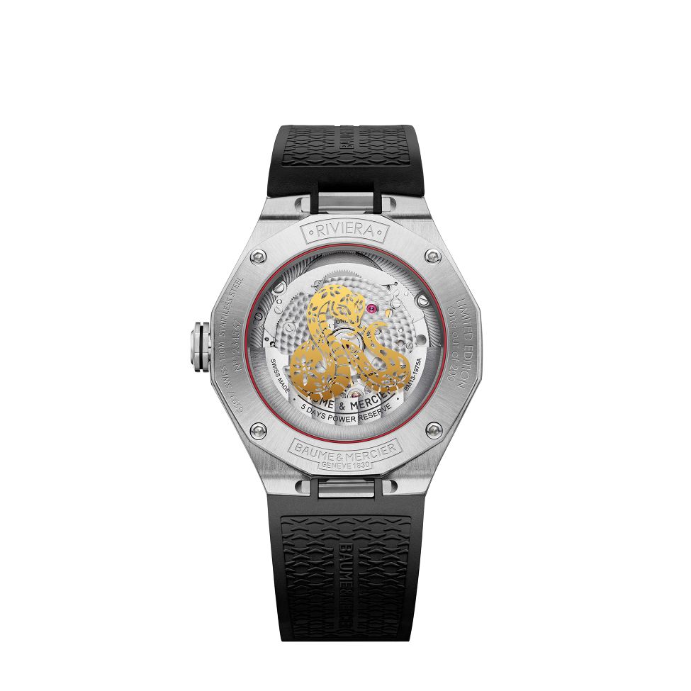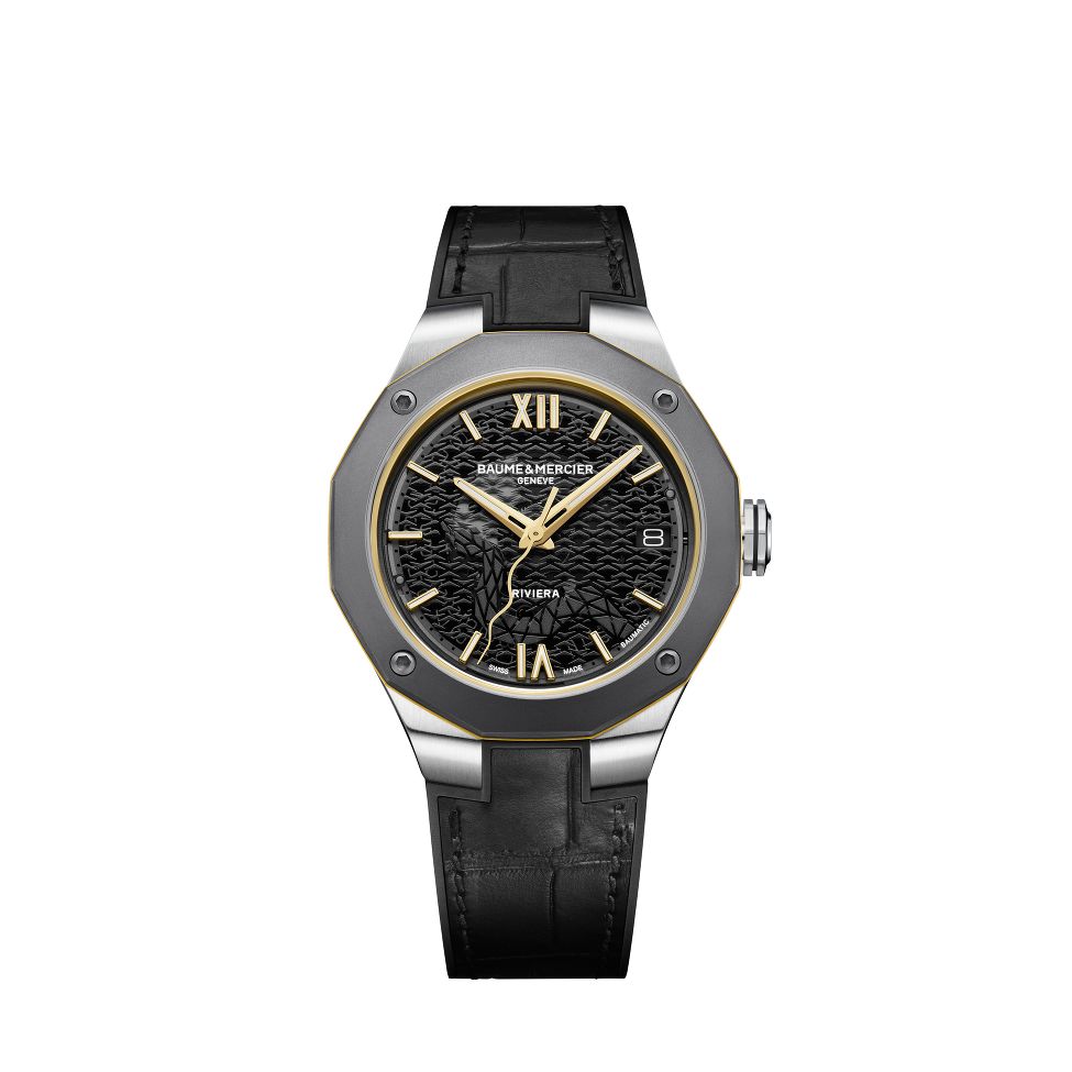 Die Riviera Chinesisches Neujahr Schlangen-Edition präsentiert sich mit einem 39-mm-Stahlgehäuse mit polierten und satinierten Oberflächen und beherbergt das Baumatic Manufakturwerk mit Datumsfunktion. Auf der Rückseite befindet sich eine metallische, vergoldete Schlangensignatur. Swiss Made mit 120 Stunden Gangreserve und 100 Meter Wasserdichtigkeit.