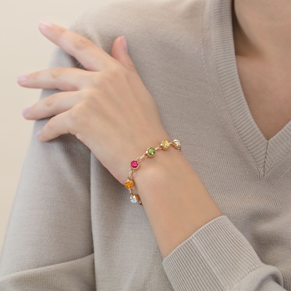Bracelet aus Rotgold mit einem hellblauen runden Aquamarin von 0.73 ct, zwei grünen runden Turmalinen von zusammen 1.67 ct, zwei pinkfarbenen runden Turmalinen von zusammen 1.63 ct, einem rosafarbenen runden Morganiten von 0.76 ct, zwei gelben runden Beryllen von zusammen 1.56 ct, einem orangefarbenen runden Mandarin-Granat von 1.14 ct sowie zwei blauen runden Tansaniten von zusammen 1.84 ct.