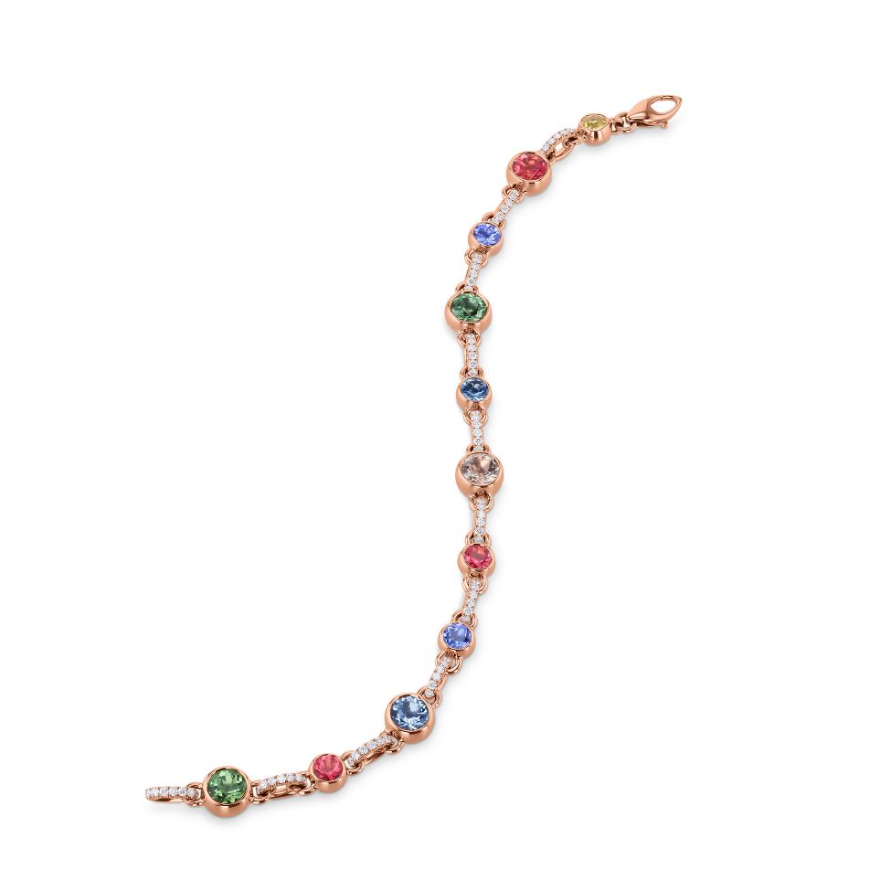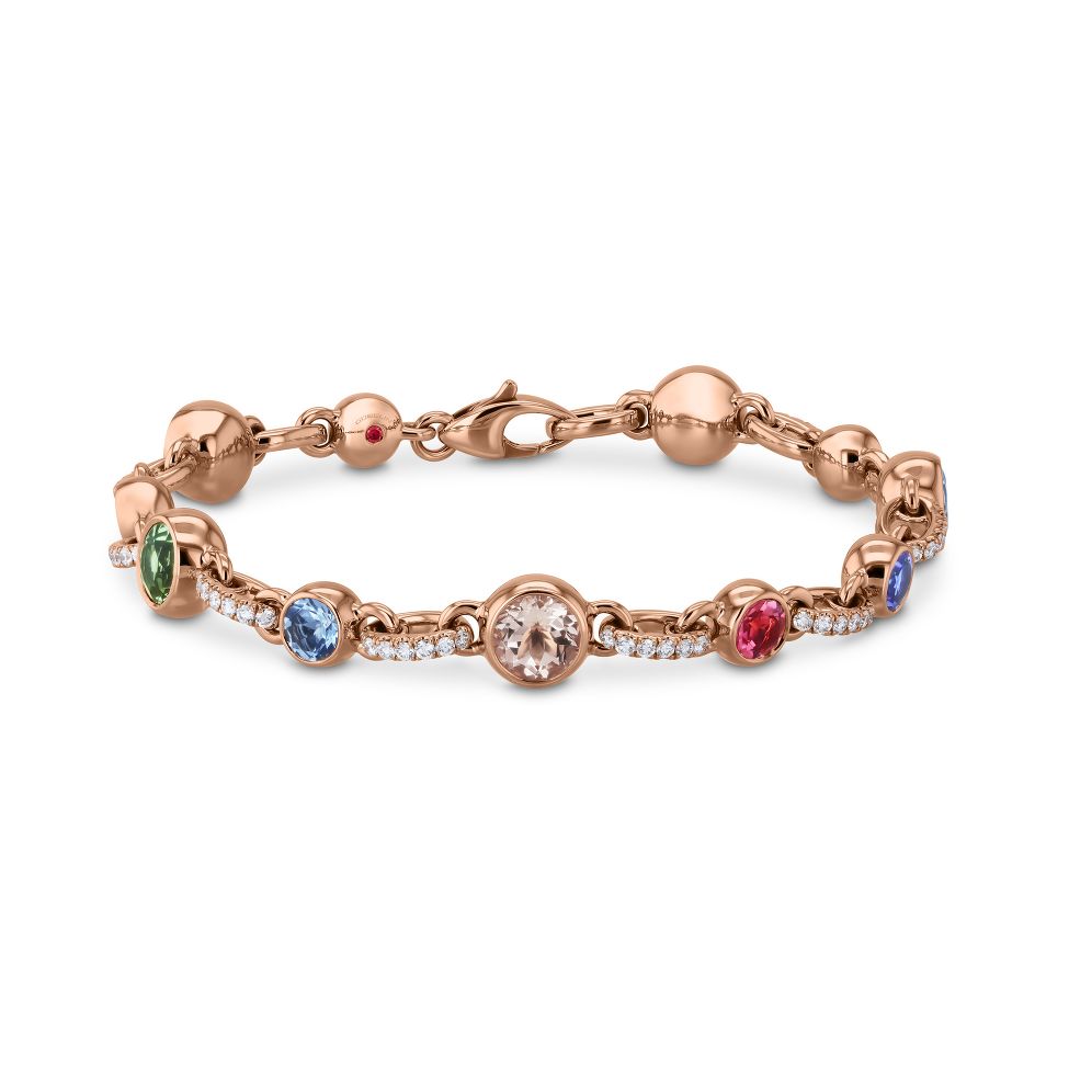 Armband aus Roségold mit 2 runden blauen Tansaniten von zusammen 0.90 ct, 1 rundem gelben Beryll von 0.31 ct, 1 rundem rosa Morganit von 0.70 ct, 3 runden pinken Turmalinen von zusammen 1.57 ct, 2 runden grünen Turmalinen von zusammen 1.93 ct und 2 runden hellblauen Aquamarinen von zusammen 1.15 ct. 77 Brillanten von zusammen 0.69 ct..