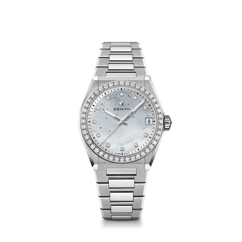 Diese elegante Uhr aus Stahl und Gelbgold besticht durch ein Zifferblatt aus handgefügtem Perlmuttmosaik mit 12 Diamantindizes. Die gelbgoldene Krone ist mit einem rosa Rubellit im Cabochonschliff besetzt. Ein poliertes, satiniertes Armband sowie ein Quarzwerk für Stunden und Minuten vervollständigen die Uhr. Wasserdicht bis 30 Meter.