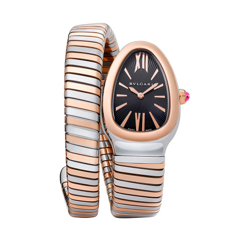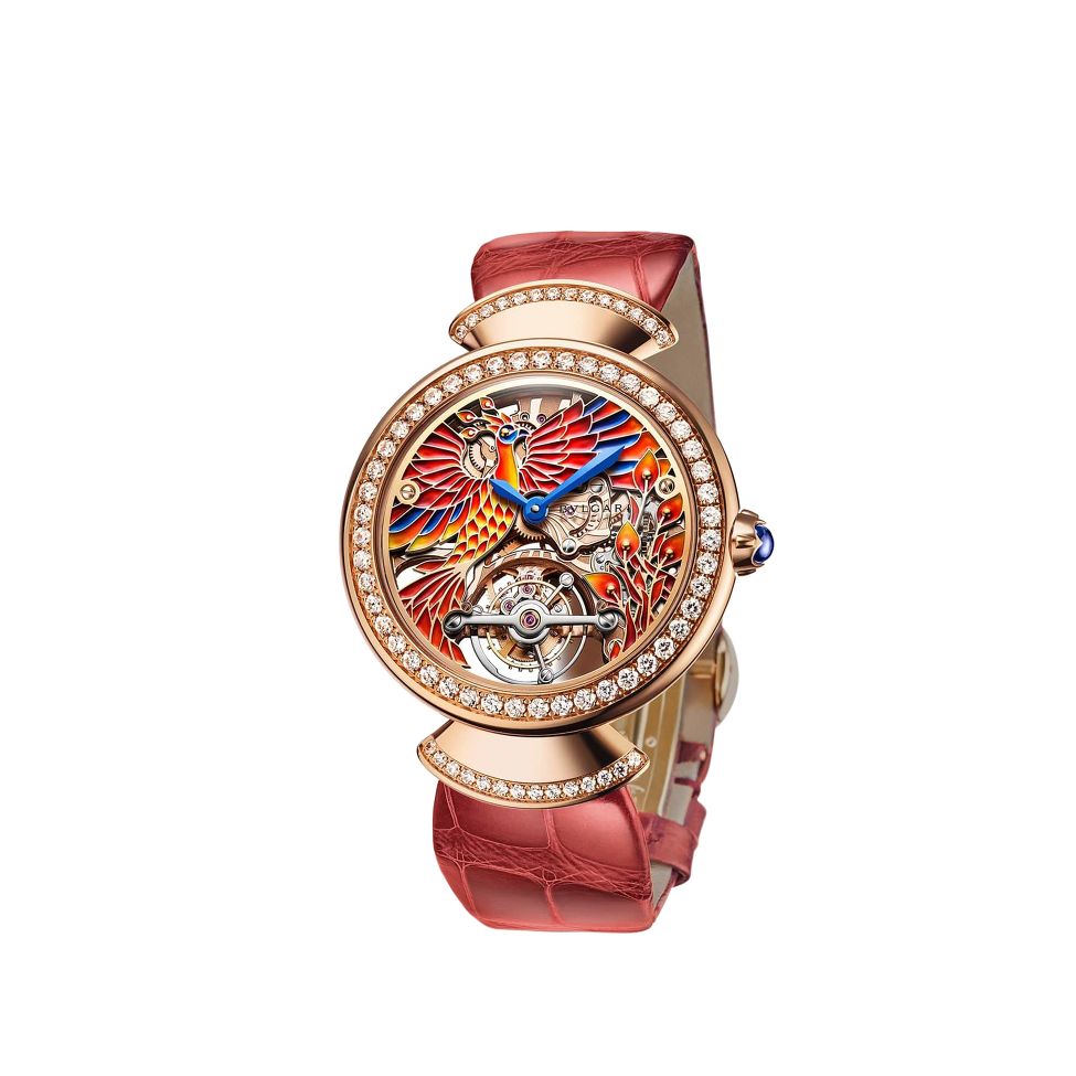 Mit Divas' Dream präsentiert Bvlgari einen einzigartigen Zeitmesser inspiriert von den Mustern der römischen Mosaiken in den Bädern des Kaisers Diocletian. Das Roségoldgehäuse wird von einer diamantenbesetzten Lünette umrahmt. Das skelettiertes Zifferblatt aus Rotgold wurde von Hand mit einem Phoenix bemalt. Die Automatikuhr ist mit dem Kaliber BVL 208SK ausgestattet, ein rotes Alligator Lederarmband verleiht dem einzigartigen Zeitmesser den letzten Schliff.