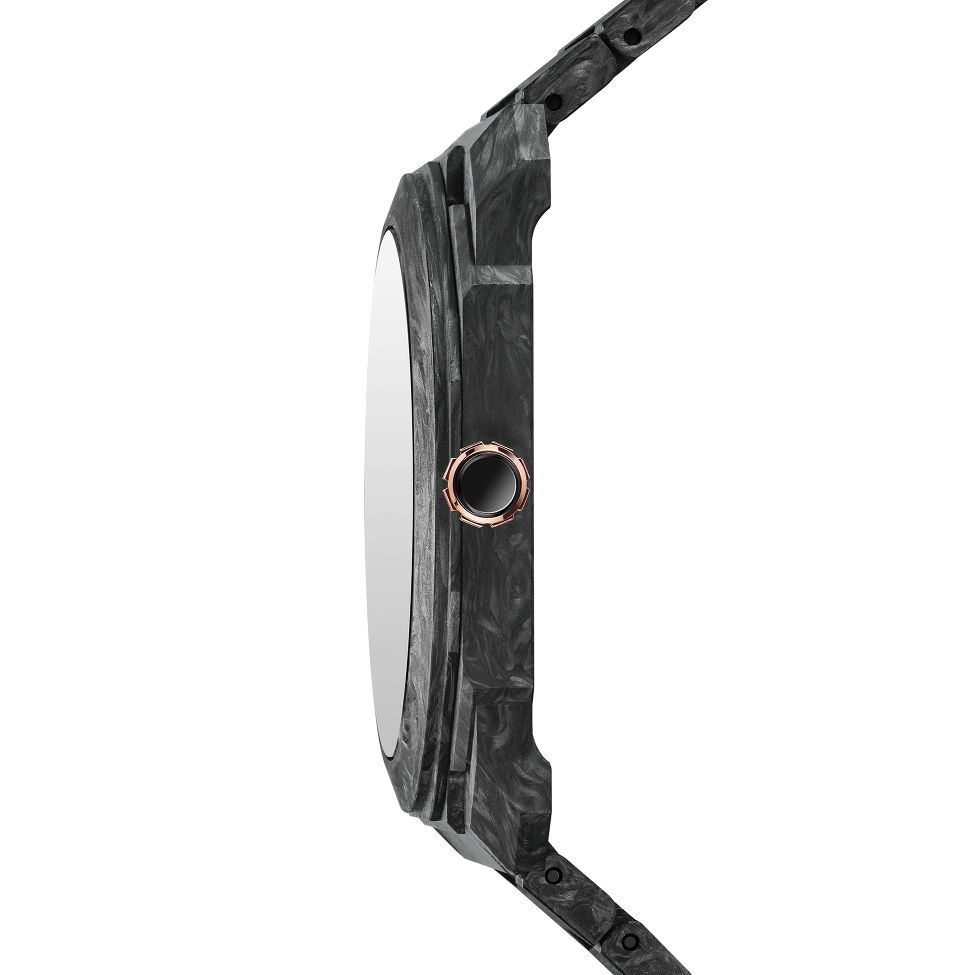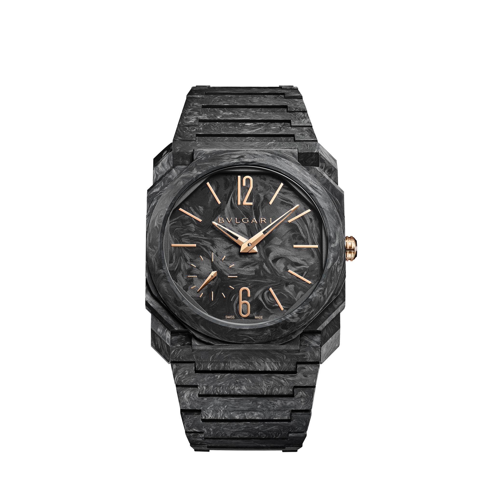 Der Bulgari Octo Finissimo CarbonGold Automatic verbindet moderne Kohlefaser mit traditionellem Luxus durch Akzente aus Roségold. Dieser Zeitmesser hat einen Durchmesser von 40 mm und eine Dicke von 6,9 mm, mit einer Wasserdichtigkeit von 100 Metern. Das mechanische Uhrwerk Caliber BVL 138 bietet eine Gangreserve von 60 Stunden und ist durch den transparenten Gehäuseboden sichtbar, der durch acht roségoldene Schrauben gesichert ist. Die Kombination von geschmiedeter Kohlefaser und Roségold kreiert eine aussergewöhnliche Optik und ein leichtes Tragegefühl .