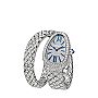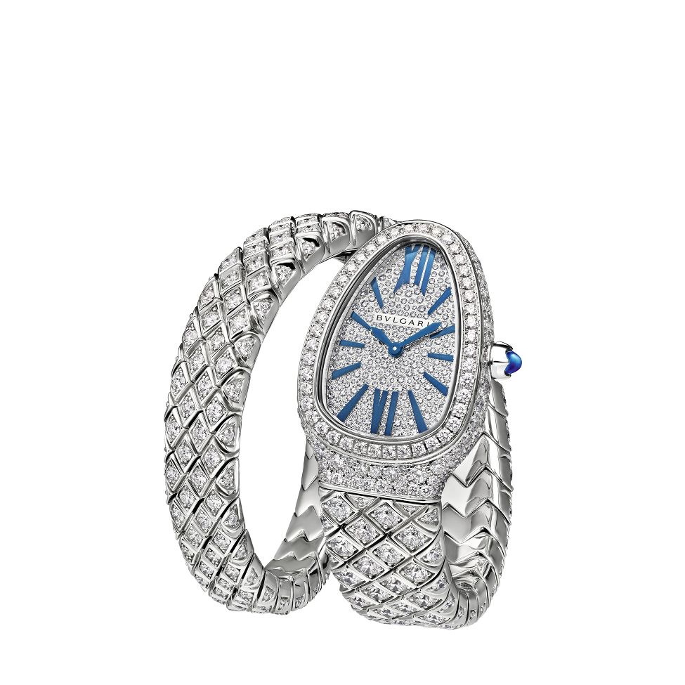 Die Bvlgari Serpenti Spiga Damenarmbanduhr beeindruckt mit ihrem 34 mm Gehäuse aus Weissgold, das präzise mit Brillanten sowohl auf dem Gehäuse als auch der Lünette besetzt ist. Die Zifferblattgestaltung zeigt blaue Zeiger und Indizes, die einen reizvollen Kontrast zum glänzenden Weissgold bieten. Ein markantes Merkmal dieser Uhr ist das zweifach gewundene Armband, kunstvoll mit Rundschliff-Brillanten besetzt, das Eleganz und luxuriösen Glanz verströmt. Angetrieben wird die Uhr durch ein präzises Quarzwerk, das Zuverlässigkeit und Präzision gewährleistet.