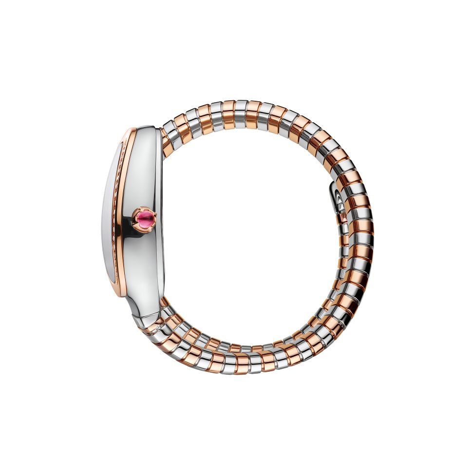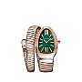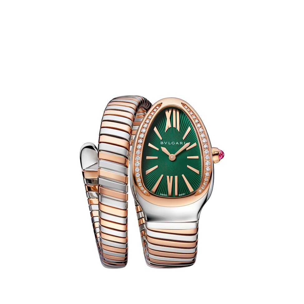 Die Serpenti Tubogas Uhr vereint Roségold und Edelstahl in einem elegant geschwungenen Armband. Mit grün lackiertem Sonnenguilloché-Zifferblatt, diamantbesetzter Lünette und ikonischer Schlangenform verkörpert sie Bulgari-Stil in seiner sinnlichsten Form. Durchmesser: 35 mm. Wasserdicht bis 30 Meter.