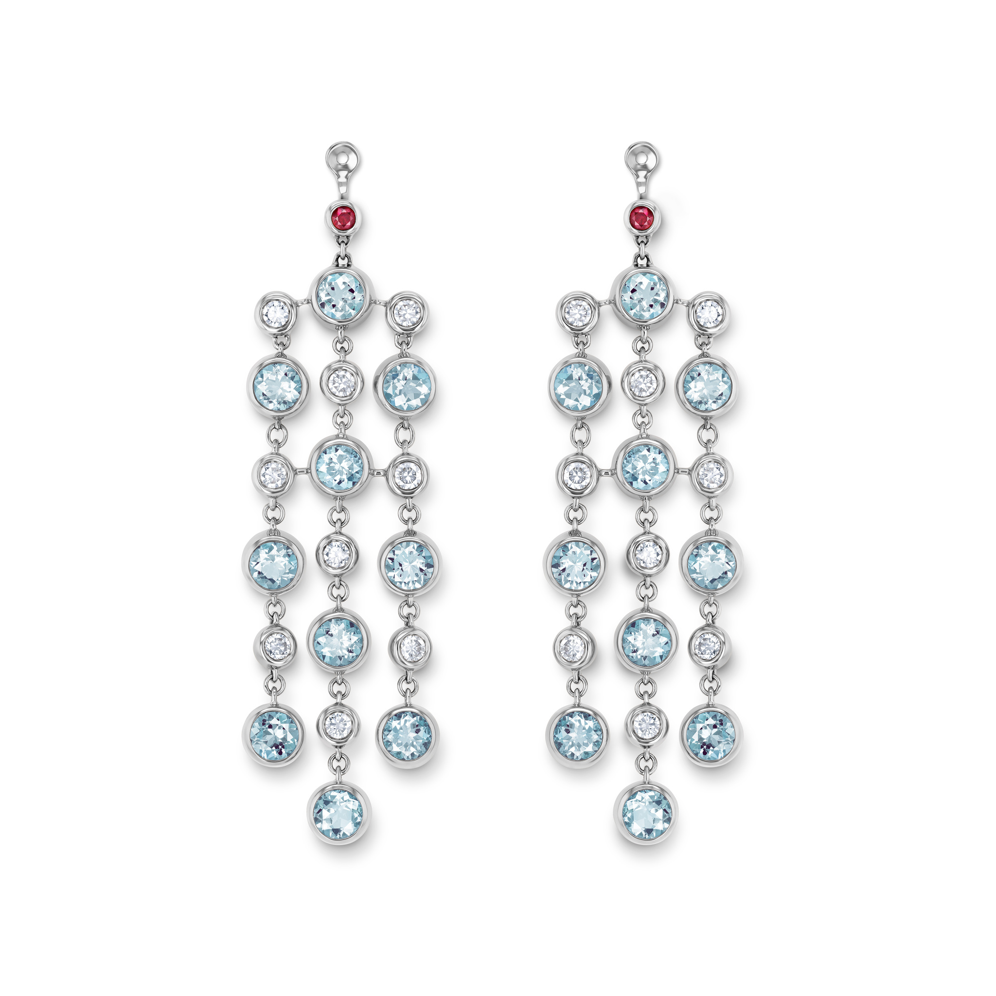 Ohrring-Anhänger in Weissgold mit 20 hellblauen runden Aquamarinen von zusammen 5.80 ct sowie 18 Brillanten von zusammen 1.28 ct. Anhänger können nur mit passenden Ohrsteckern getragen werden.
