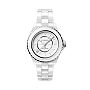 Die J12 Phantom von CHANEL bewahrt auch in der Neuauflage die Designcodes sie einst zur Legende machte. Das Keramik- und Edelstahlgehäuse verfügt über eine edelstahl-umsäumte, einseitig drehbare Lünette. Diese umgibt das Zifferblatt mit farblich abgestimmten arabischen Ziffern. Der transparente Gehäuseboden präsentiert das Swiss Made Automatikkaliber 12.1 mit einer Gangreserve von 70 Stunden. CHANEL bietet auf das COSC-zertifizierte Werk eine Garantie von fünf Jahren. Ein Keramikgliederarmband rundet die Uhr ab.