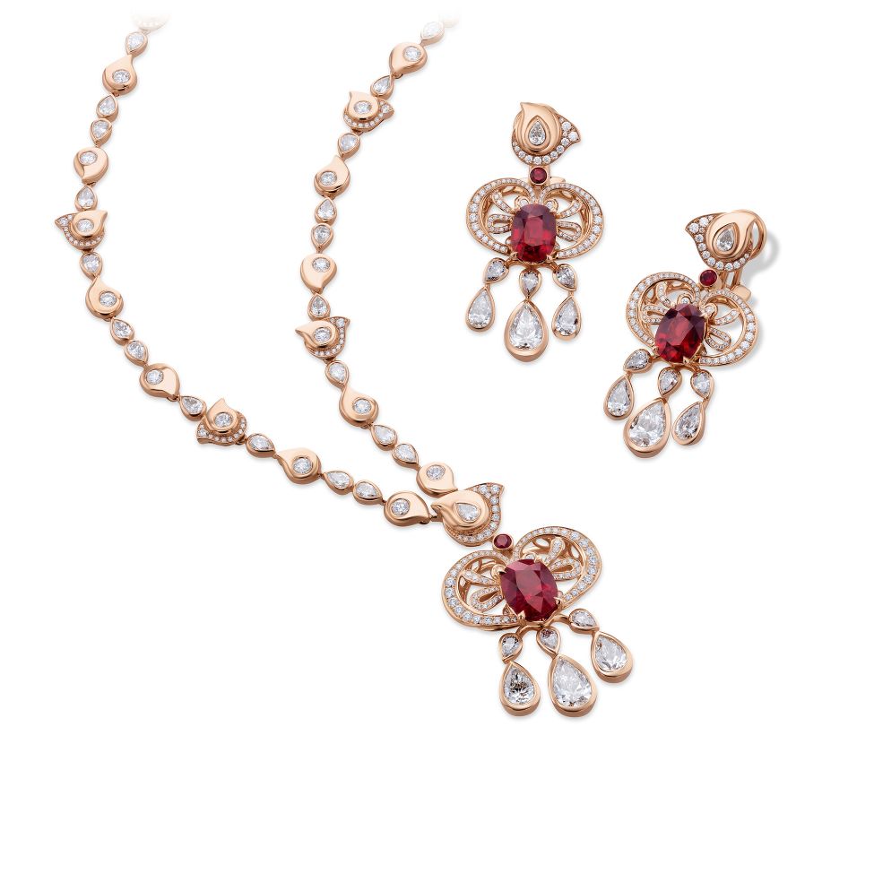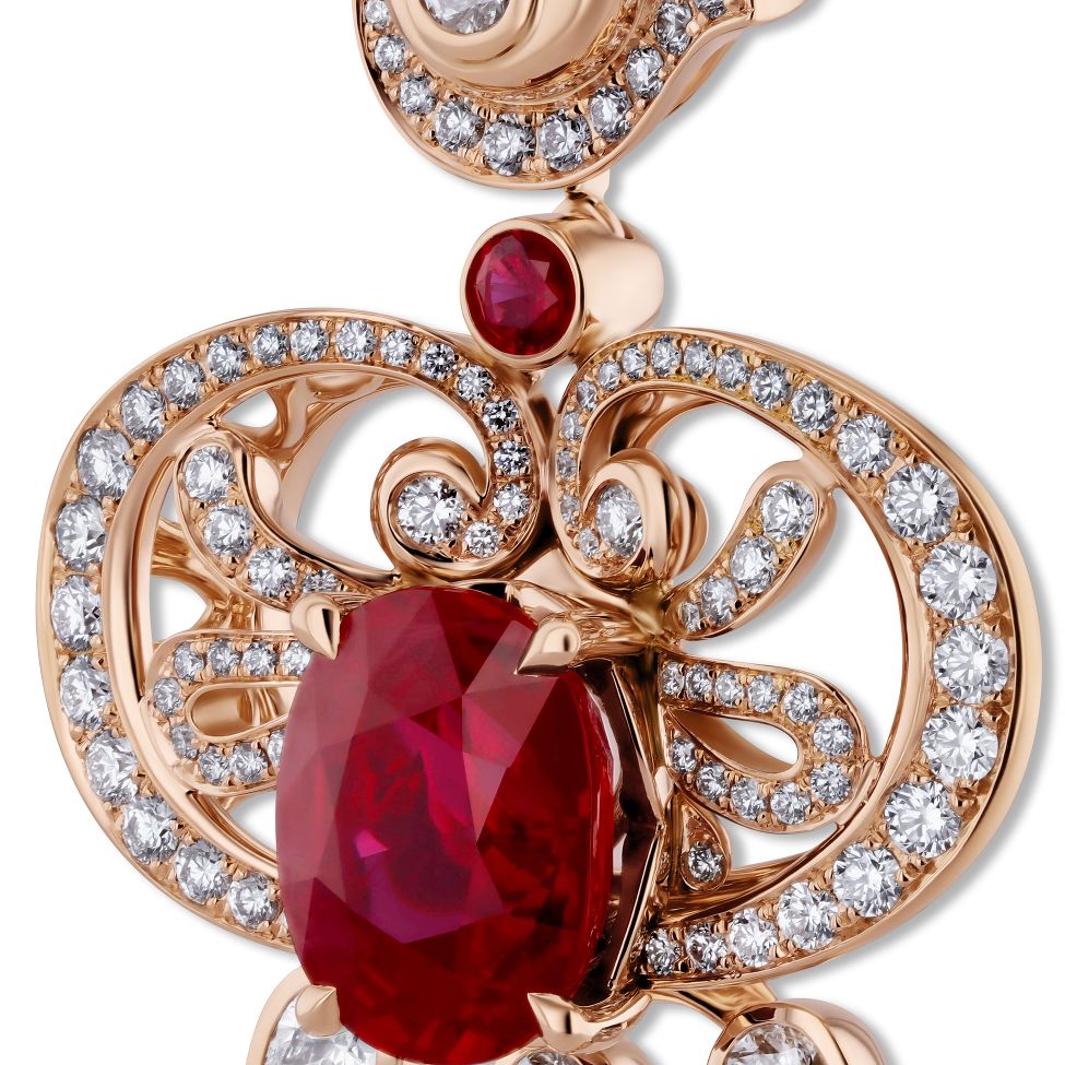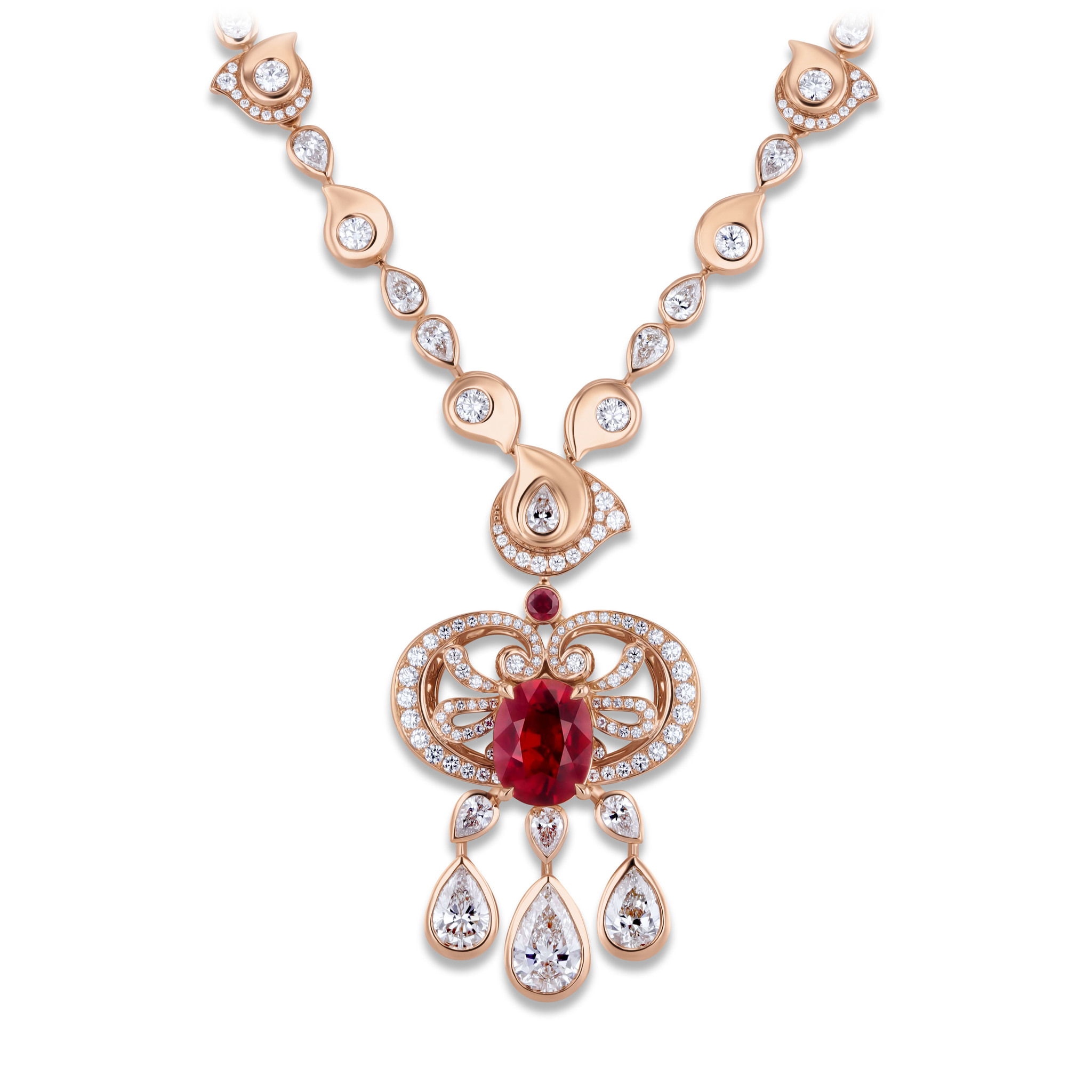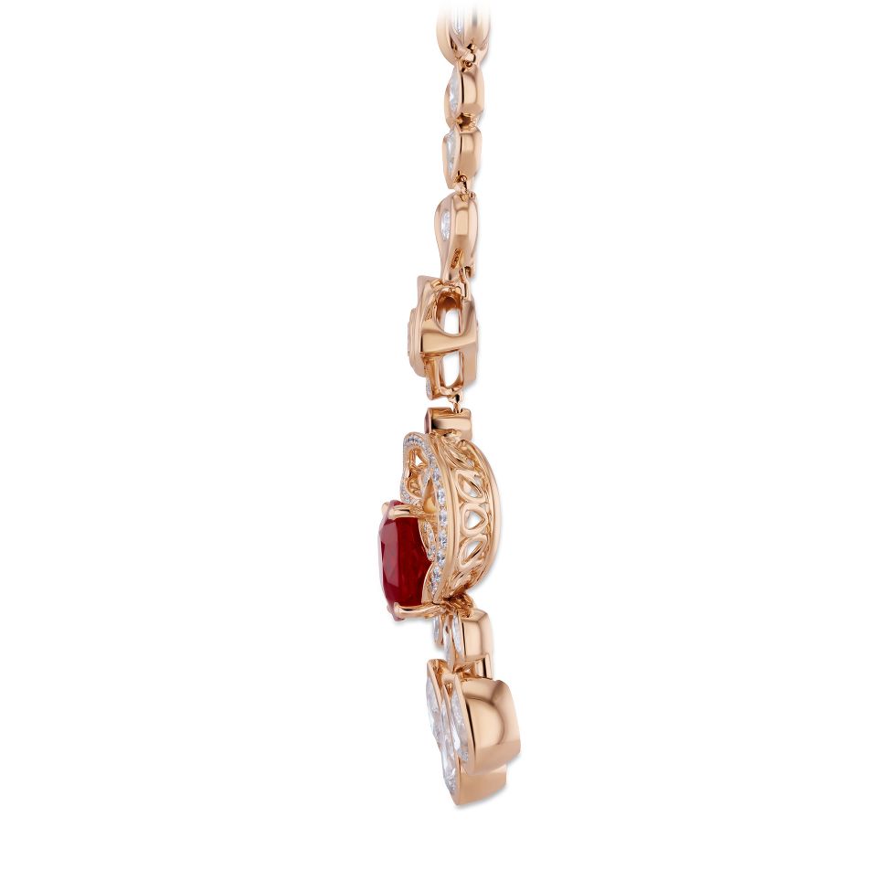 Collier aus Roségold mit einem ovalen Rubin, 3.04 ct, aus Burma, sowie 1 Tropfendiamant von 0.52 ct, 1 Tropfendiamant von 0.80 ct, 1 Tropfendiamant von 0.50 ct, 225 Brillanten von zusammen 2.77 ct und 44 Tropfendiamanten von zusammen 4.18 ct.