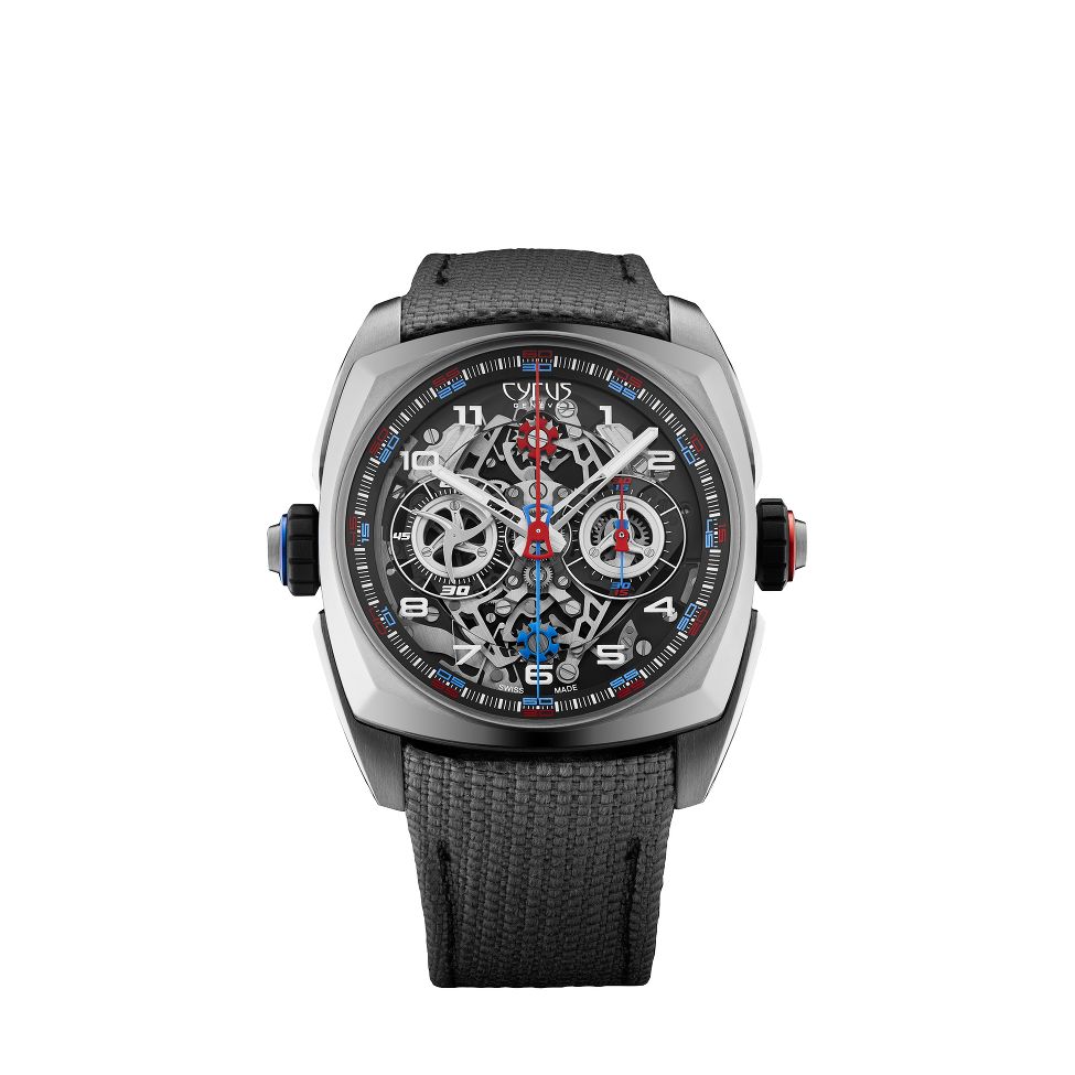 Die auf 50 Exemplare limitierte Klepcys DICE Titanium vereint innovative Chronographentechnik mit modernem Design. Im 42 mm Gehaeuse aus Titan Grade 5 arbeitet das automatische Kaliber CYR718 mit 443 Komponenten und 60 Stunden Gangreserve. Zwei unabhaengige Monopusher-Chronographen mit roten und blauen Zeigern ermoeglichen praezise Messungen. Ein 3D-skelettiertes Zifferblatt mit Leuchtakzenten, Saphirglas und eine Wasserdichtheit bis 100 Meter unterstreichen die Robustheit. Ein graues Cordura-Band vollendet diese exklusive Uhr.
