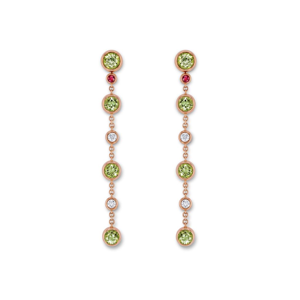 Ohrring-Anhänger in Rotgold mit sechs grünen runden Turmalinen von zusammen 2.34 ct sowie vier Brillanten von zusammen 0.28 ct. Anhänger können nur mit passenden Ohrsteckern getragen werden.