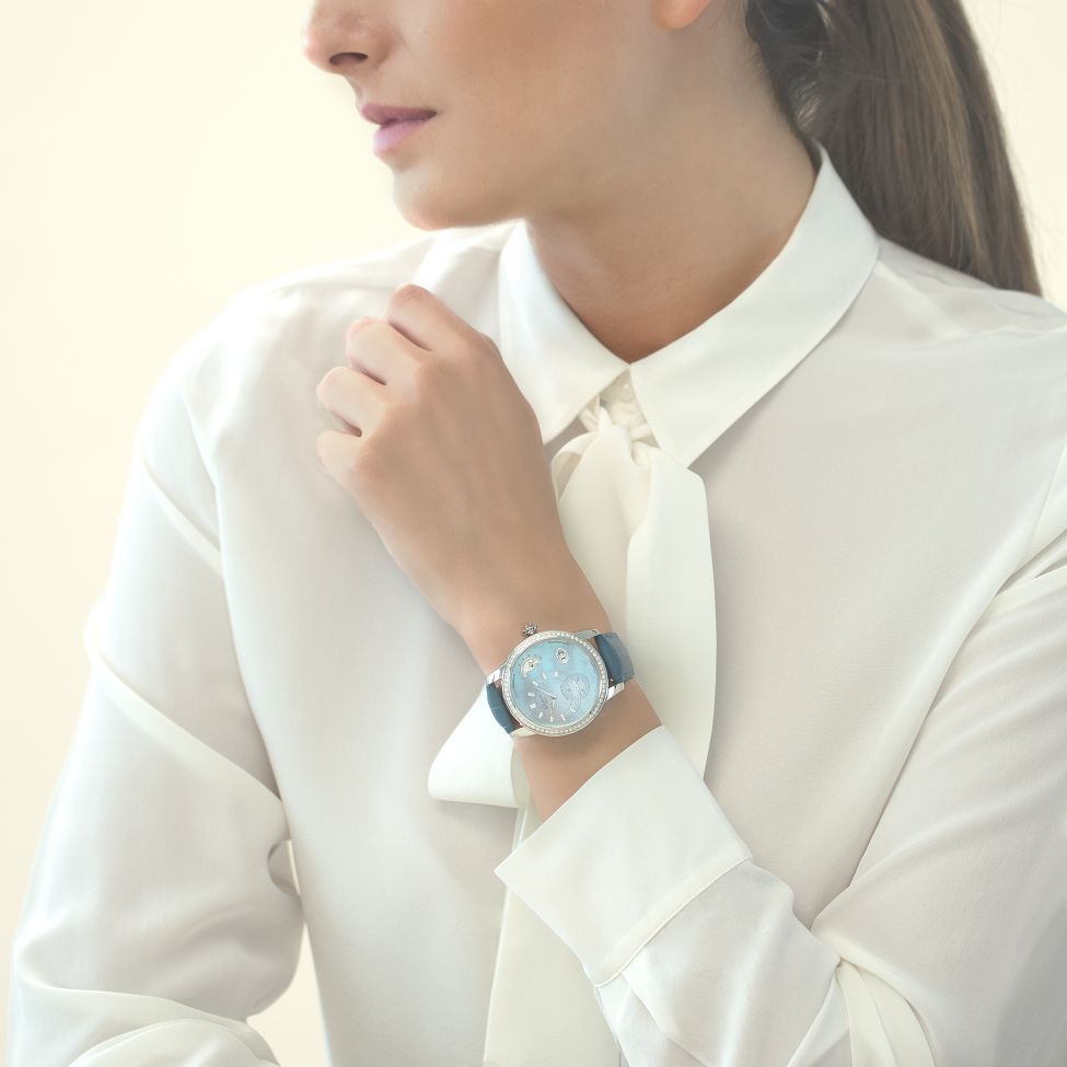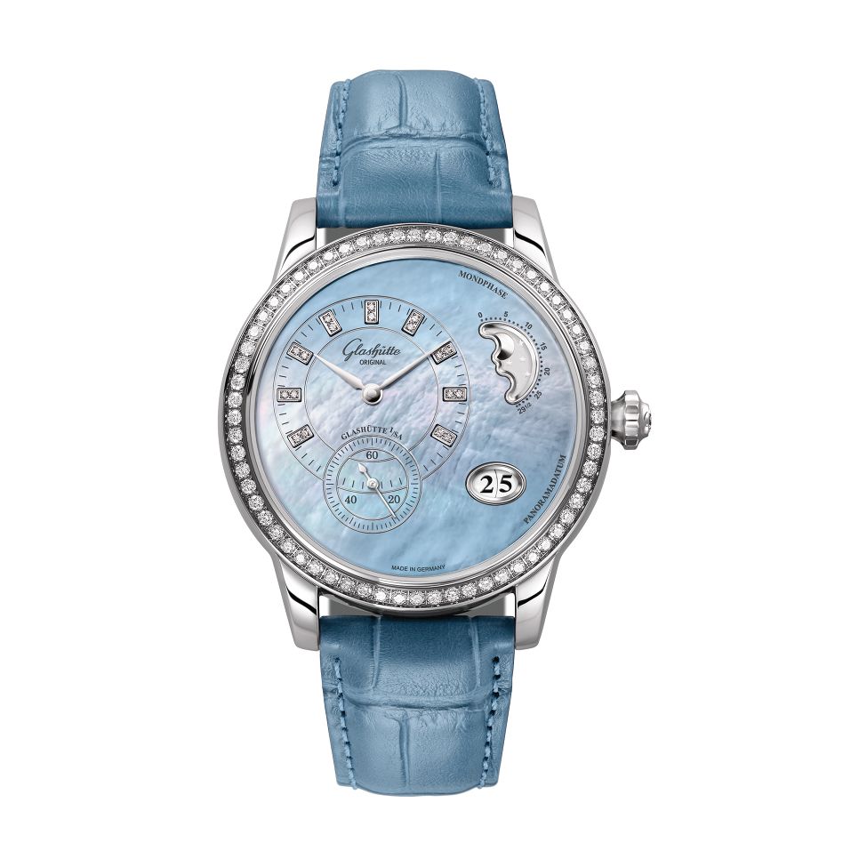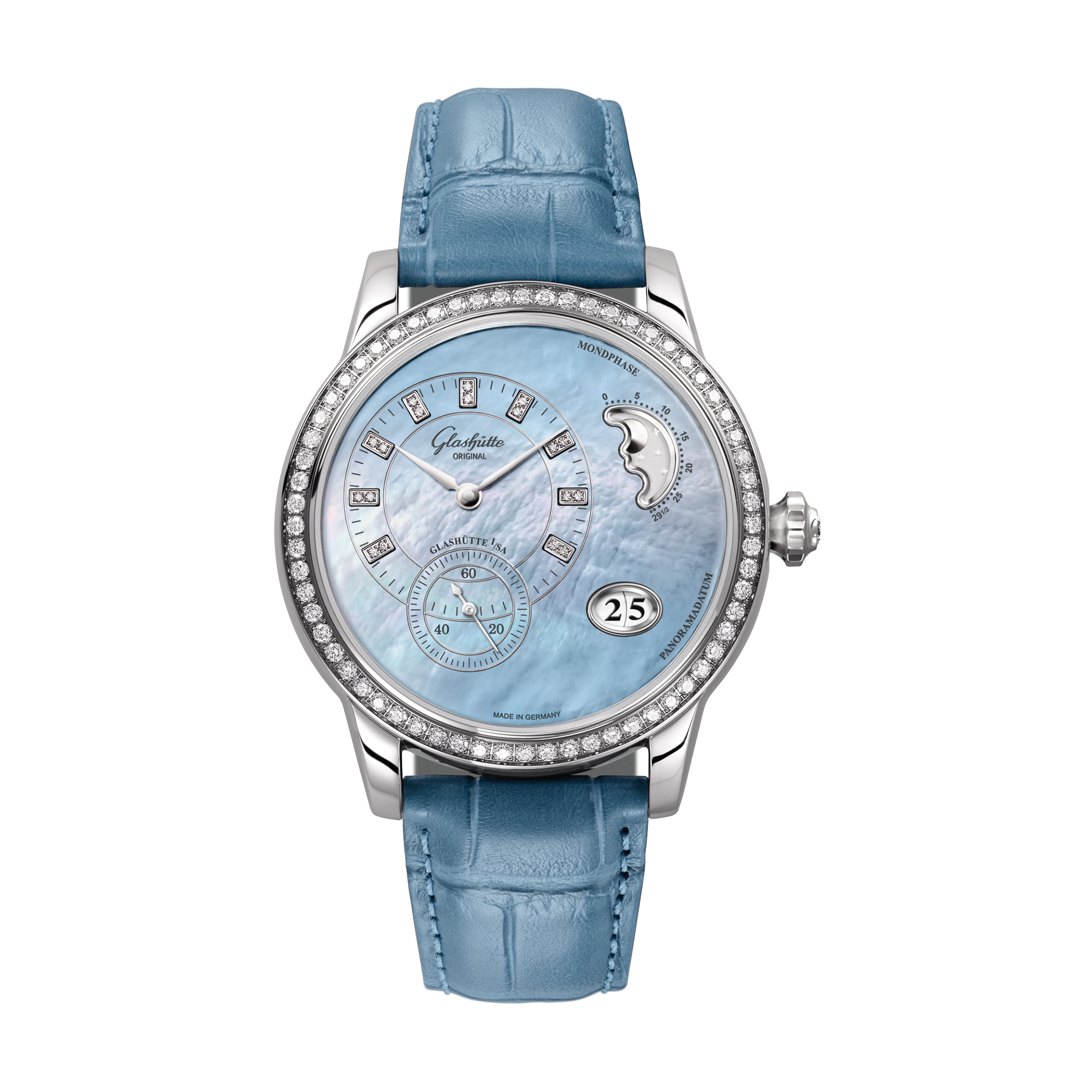 Mit der PanoMatic Luna feiert Glashütte Original himmlische Details an modernen Zeitmessern für das zarte Geschlecht. Das Edelstahlgehäuse präsentiert eine diamantbesetzte Lünette. Das Perlmuttzifferblatt verfügt über dezentrale Anzeigen für Stunde, Minute und kleine Sekunde sowie Mondphase und Panoramadatum. Der transparente Gehäuseboden ermöglicht den Blick auf das 90-12 Automatikwerk mit 42 Stunden Gangreserve. Ein blaues Louisiana Alligatorleder Armband mit Faltschliesse rundet den Zeitmesser ab.