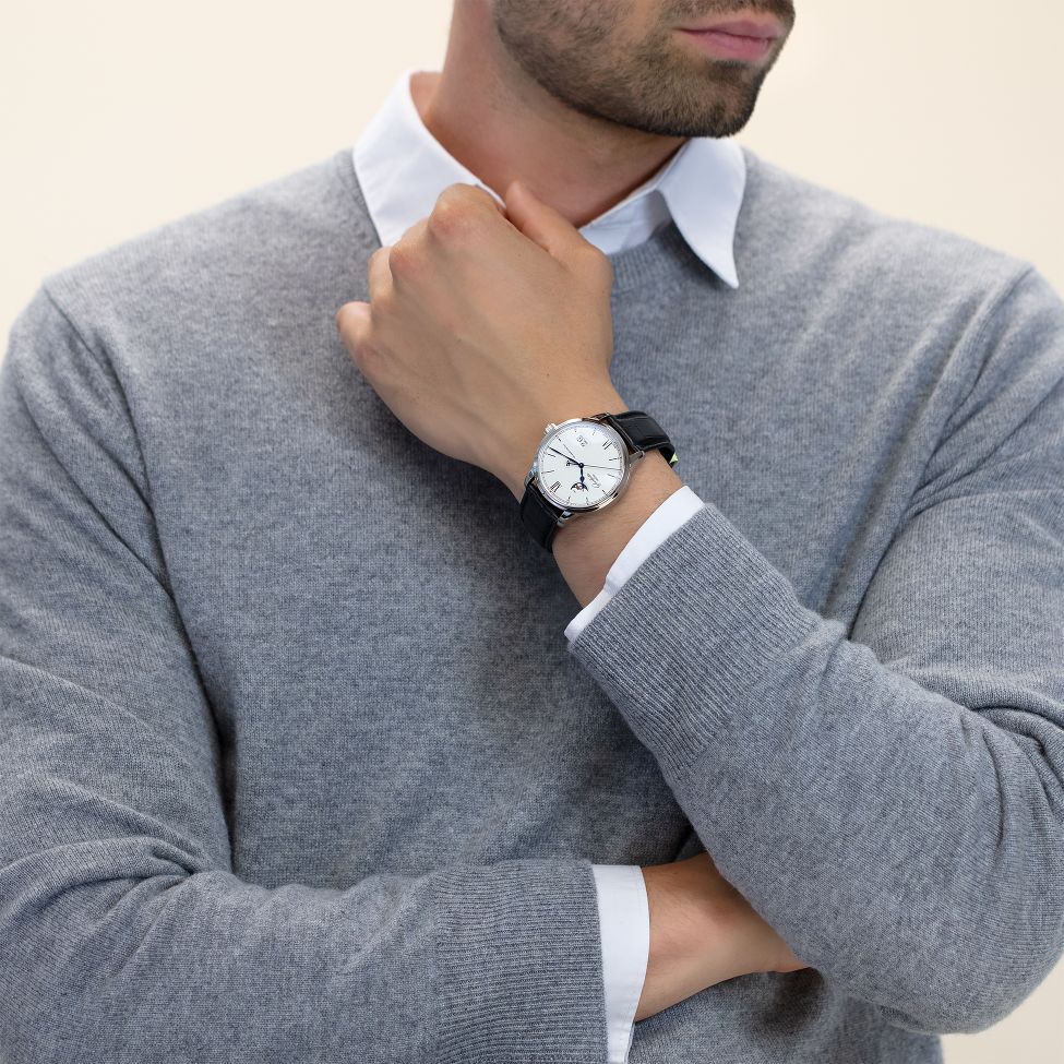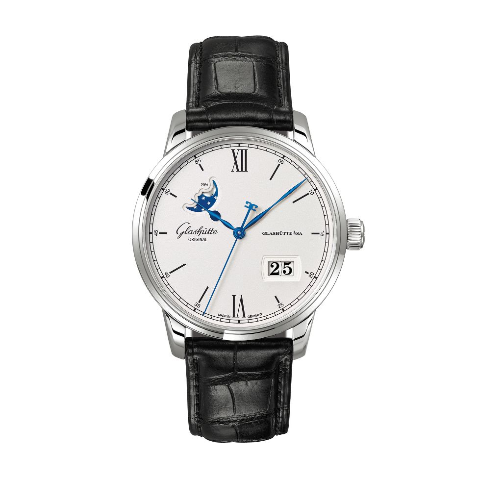 Die Senator Excellence Panoramadatum Mondphase von Glashütte Original vereint zwei der beliebtesten Komplikationen. Das 40 mm Edelstahlgehäuse präsentiert das lackierte, silber-grainé Zifferblatt mit schwarzen, römischen Ziffern und gebläuten Zeigern, die Datumanzeige liegt auf vier, die Mondphase auf zehn Uhr. Der transparente Gehäuseboden ermöglicht den Blick auf das Automatikkaliber 36-04. Ein schwarzes Louisiana Alligatorleder Armband mit einer Faltschliesse rundet den Zeitmesser ab.