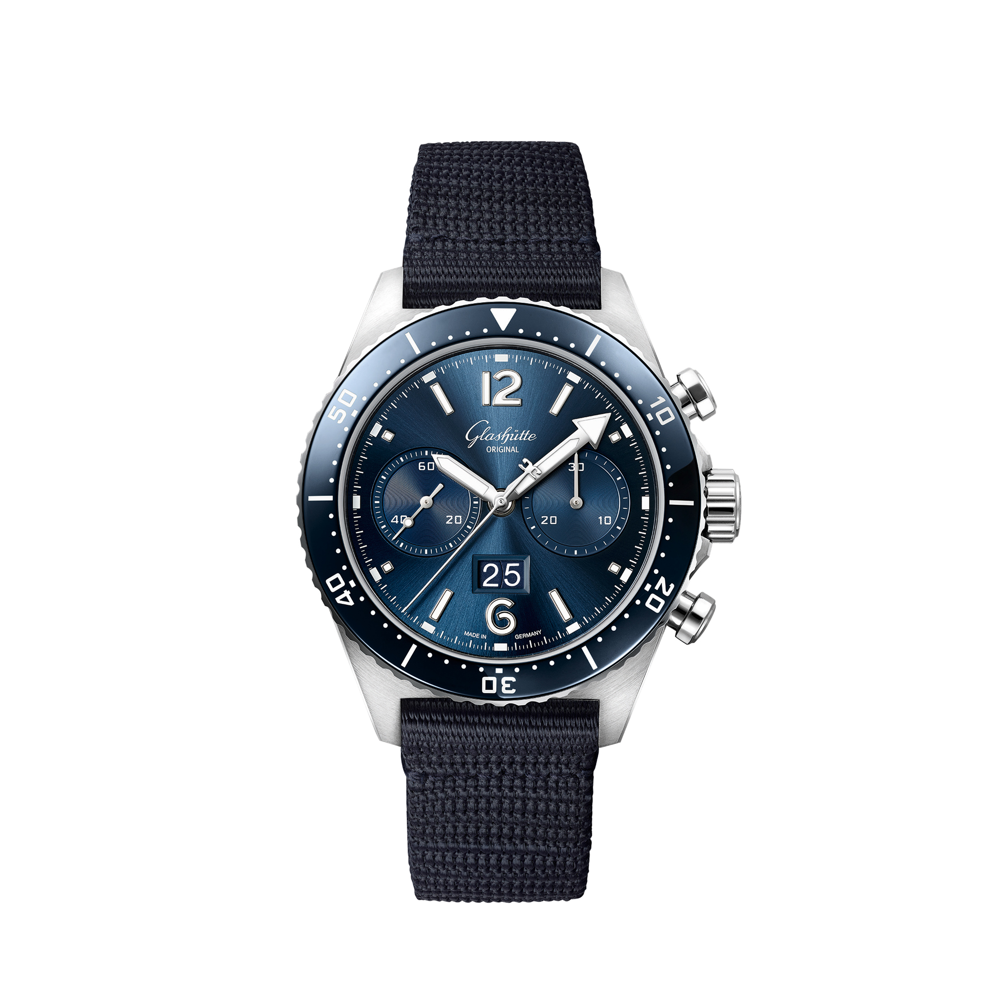Inspiriert von der ersten Glashütter Taucheruhr ist der sportlichen SeaQ Modelle der ideale Begleiter eines abenteuerlichen Lebens. Inspiriert von der ersten Glashütter Taucheruhr, ist das sportliche Modell SeaQ der ideale Begleiter für ein abenteuerliches Leben. Die Kombination aus dem Edelstahlgehäuse und der drehbaren Lünette mit dunkelblauer, kratzfester Keramikeinlage verleiht der Uhr einen markanten Look. Das handgefertigte, blau PVD-beschichtete Zifferblatt präsentiert die Chronographenzählern, sowie das weisse Panoramadatum. Die arabischen Ziffern, Indizes und Zeiger sind mit Super-LumiNova® beschichtet. Das Automatikwerk 37-23 ist durch den transparenten Gehäuseboden sichtbar und ein Armband aus synthetischem Stoff rundet die Uhr ab.